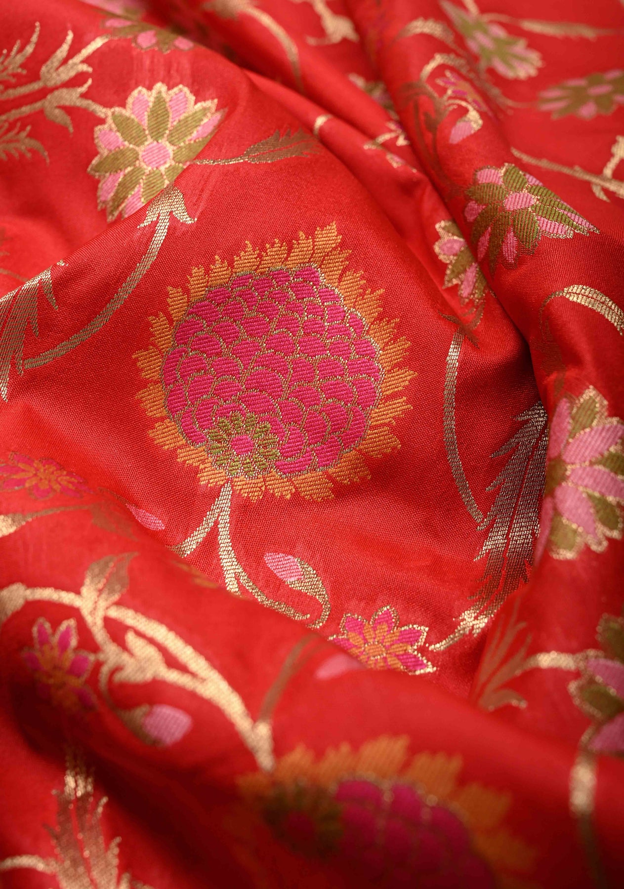 This exquisite red semi-silk saree is a perfect blend of traditional elegance and modern charm. Crafted with finesse, the saree features an intricate Meenakari floral jaal spread gracefully across the fabric, showcasing fine craftsmanship and vibrant detailing. The lustrous semi-silk base adds a subtle sheen, enhancing its rich and regal appeal. Complementing the floral motifs is a beautifully woven zari border, which adds a touch of opulence and sophistication. Ideal for festive occasions, weddings, or cultural celebrations, this saree captures the timeless essence of Indian heritage while offering comfort and style
