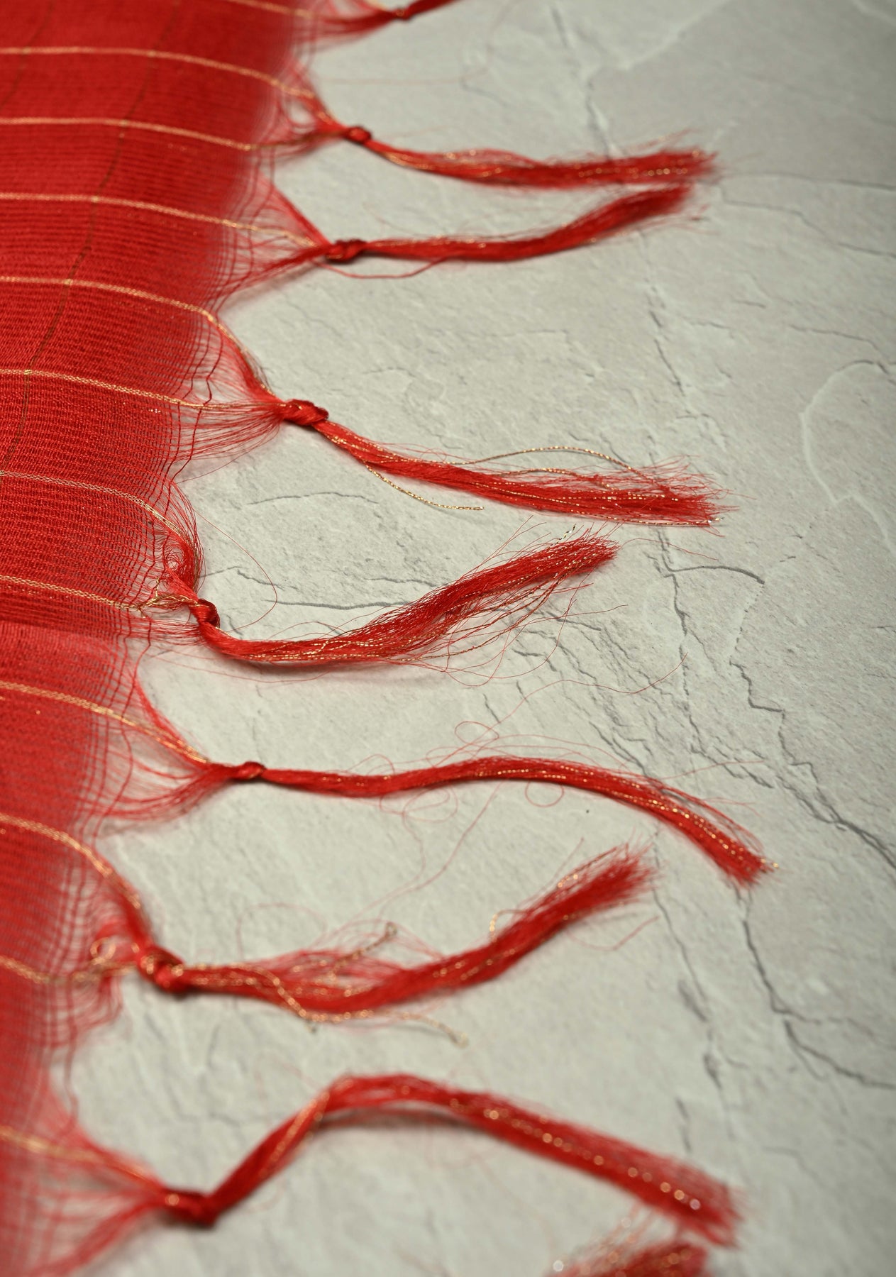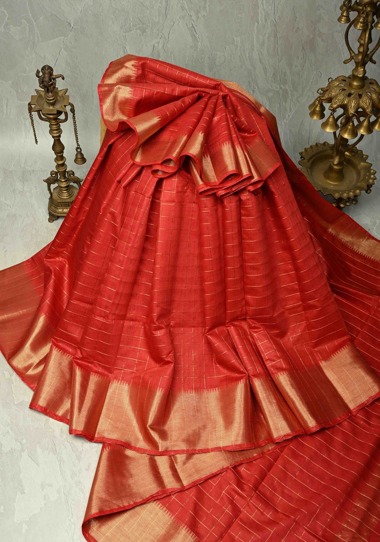 Red Semi Tussar Saree with Zari Checks and Temple Zari Border