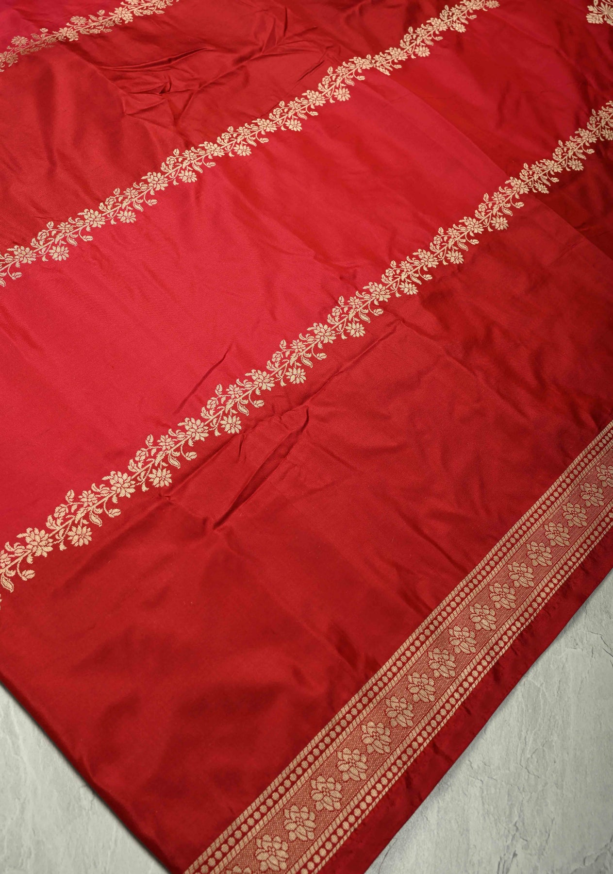 This Shades of Red Banarasi Katan Silk Saree with Vine Zari Stripes and Zari Border is a breathtaking blend of traditional craftsmanship and timeless elegance. Handwoven from the Katan silk, it features intricate vine-inspired zari stripes that run gracefully across the body, adding a subtle shimmer and refined texture. The Shades of Red hue exudes royal sophistication, beautifully complemented by the ornate golden zari border and pallu. Smooth, lustrous, and luxurious, this saree is perfect for weddings, festive occasions, and grand celebrations — a true reflection of Banarasi opulence and enduring beauty.
