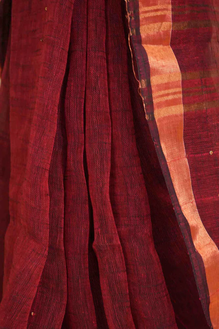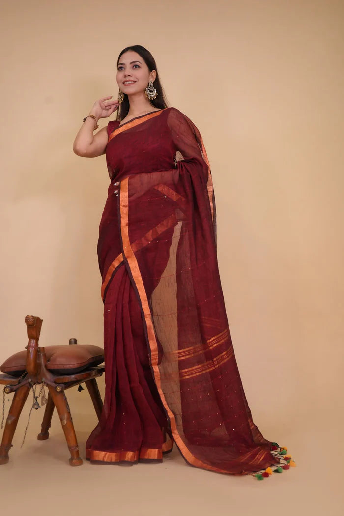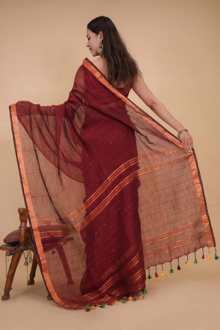 Maroon Handloom Cotton Linen Interwoven Sequins with Tassels In Pallu Ready To Wear Saree