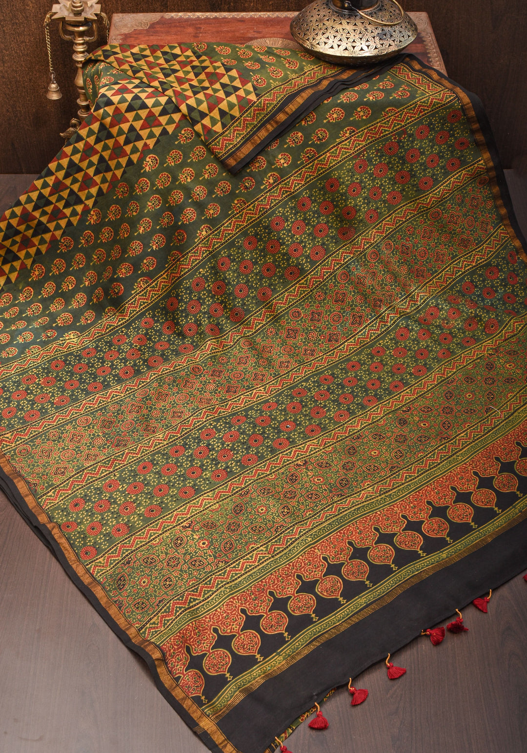 Ajrakh Hand Block Print on Green Modal Silk Saree with mirror and sequins Hand embroidery