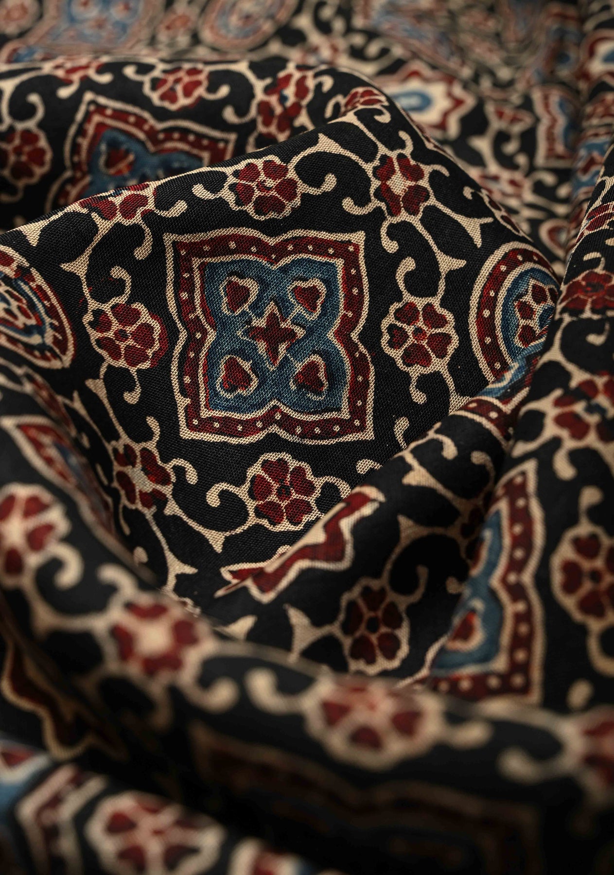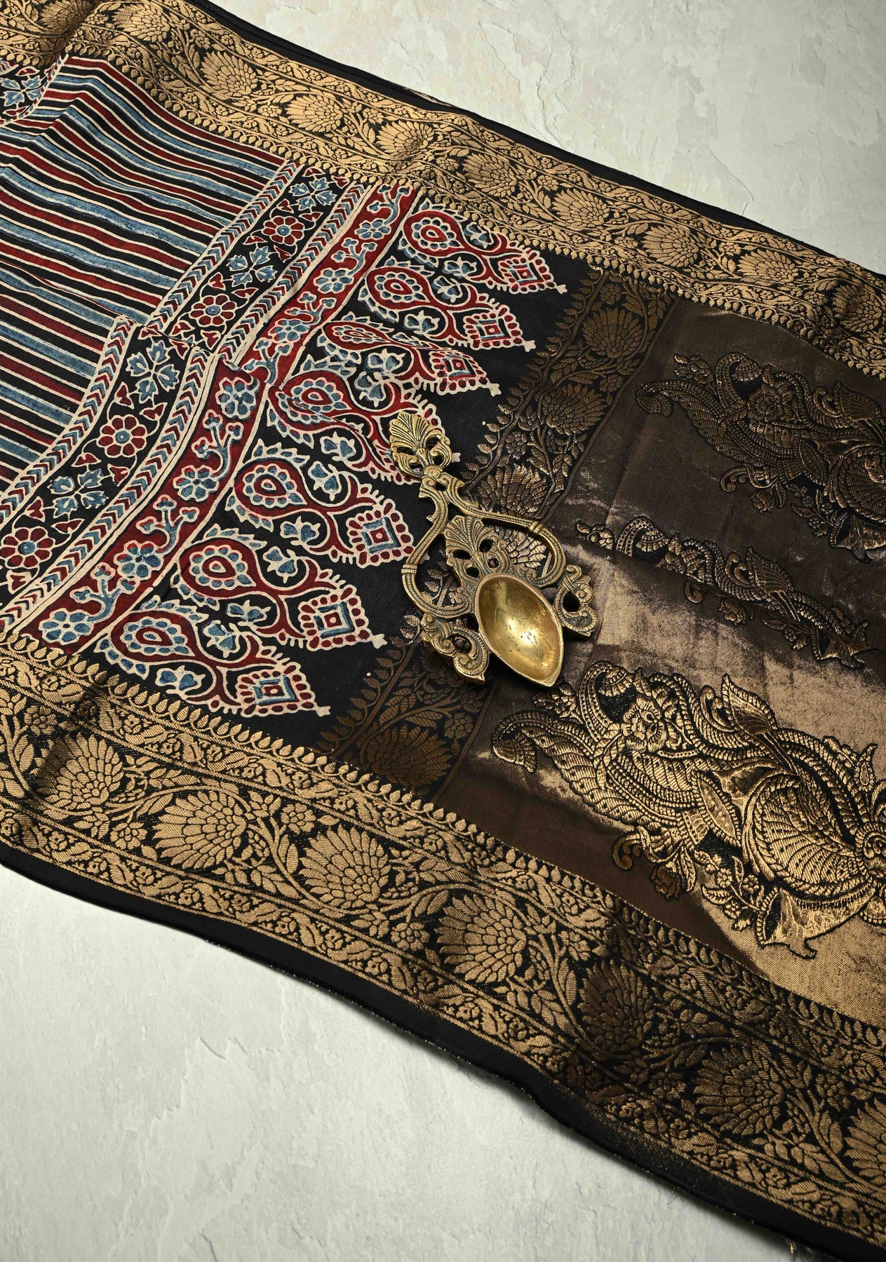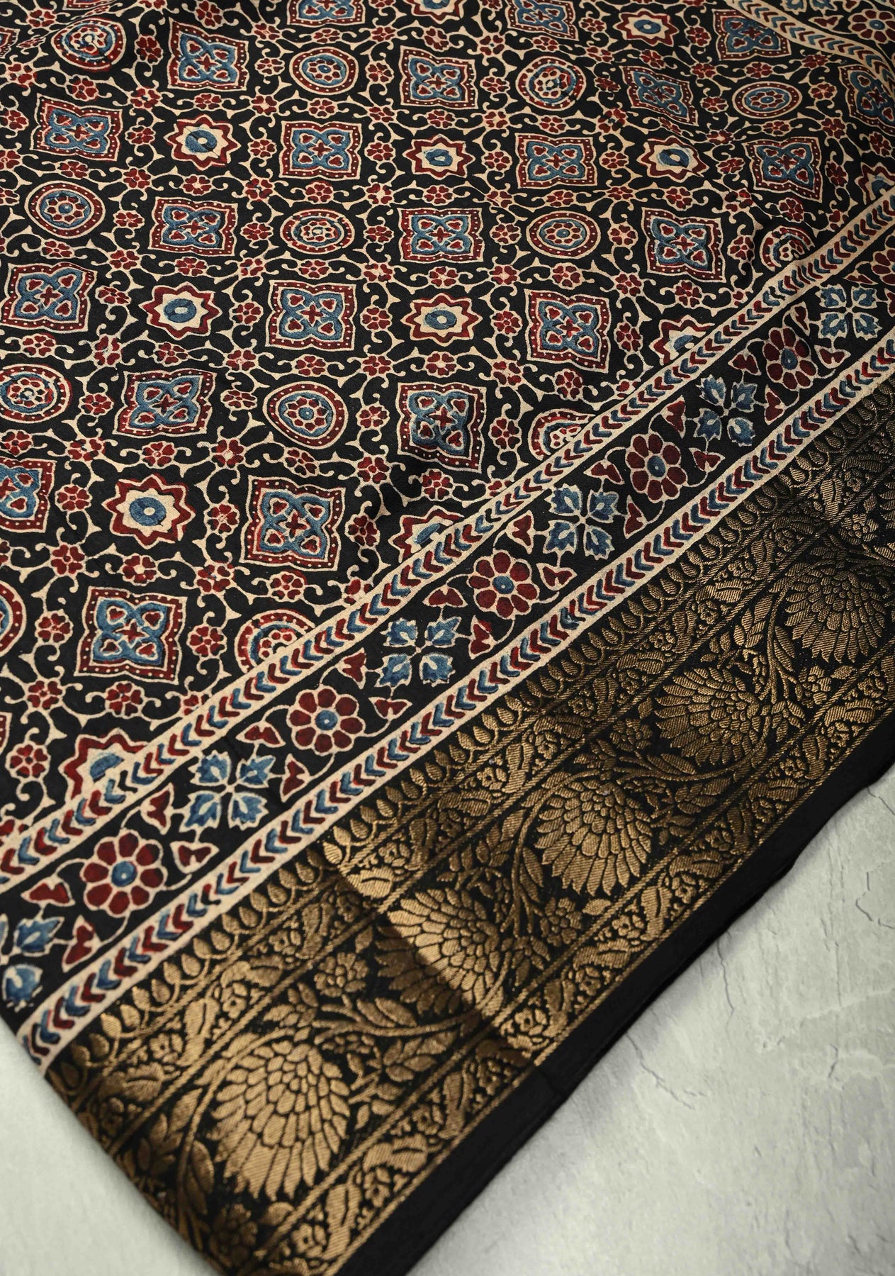 This Black Dola Silk Saree beautifully combines elegance and tradition with its stunning Ajrakh hand block print and fancy zari border. Crafted from Dola silk, the saree offers a smooth texture and graceful drape, making it perfect for festive celebrations and special occasions. The black hue adds a touch of sophistication, while the intricate Ajrakh motifs and shimmering zari detailing enhance its timeless appeal. A perfect choice for those who appreciate refined craftsmanship and heritage-inspired fashion.