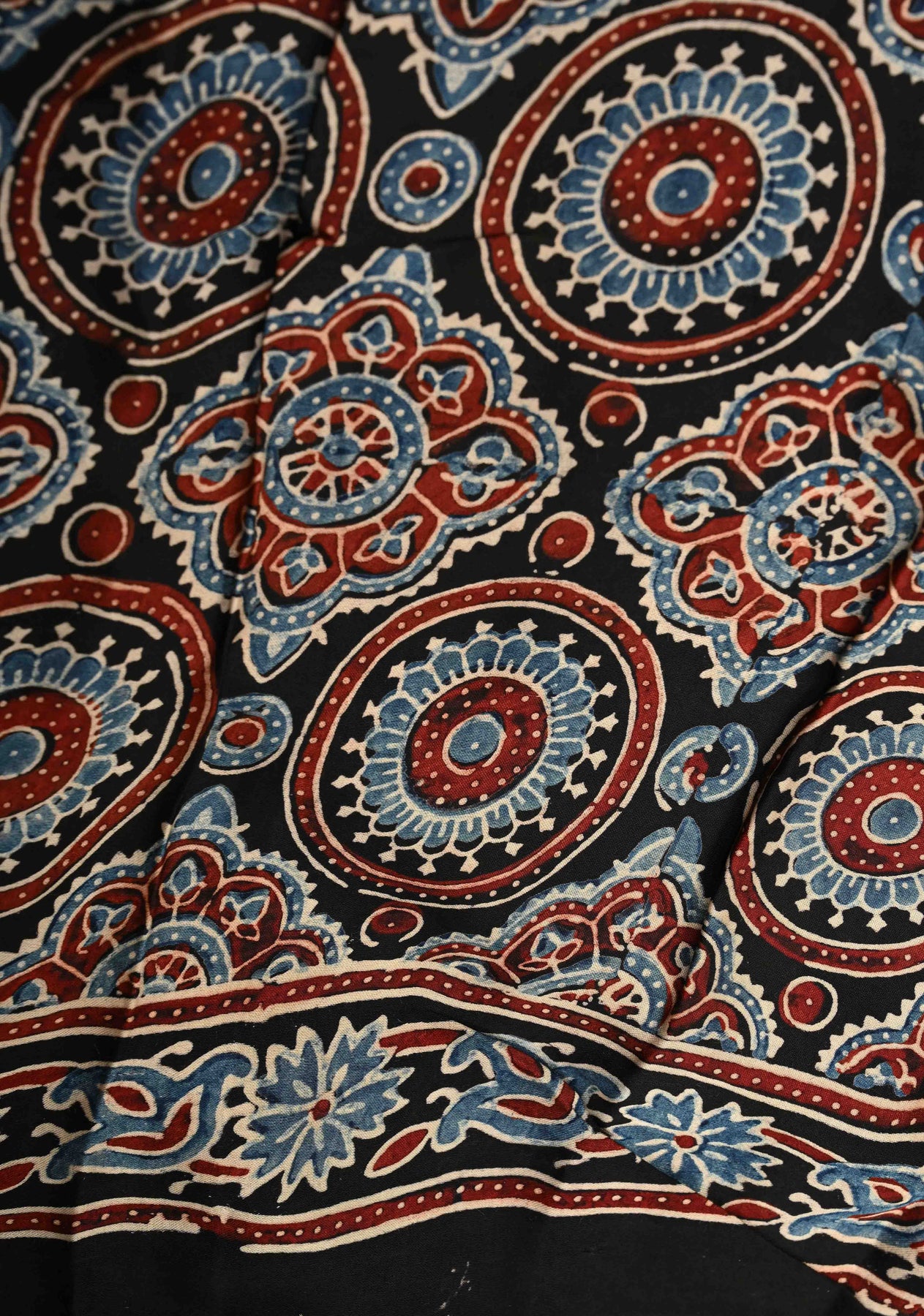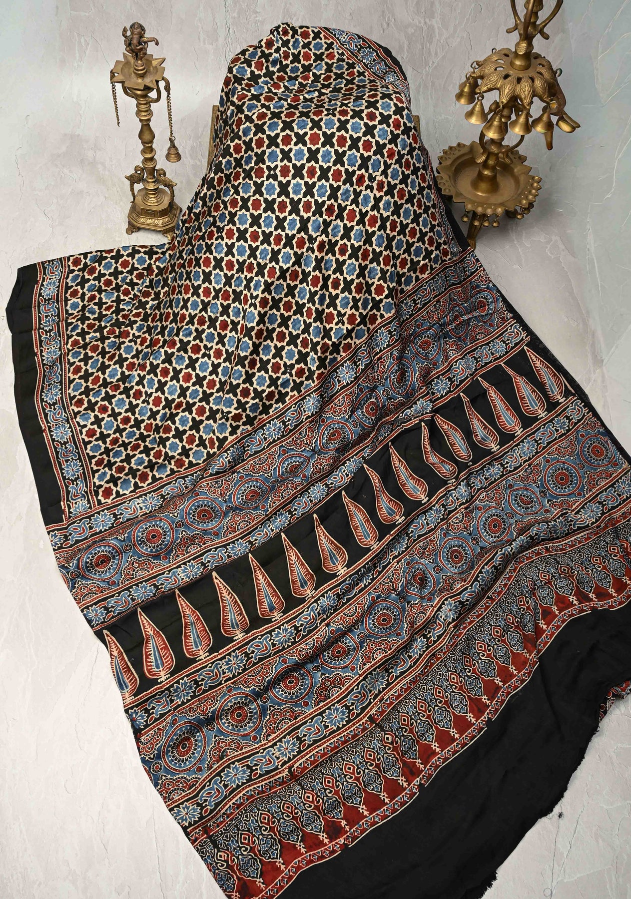 Black Modal Silk Saree with Ajrakh Hand Block Print