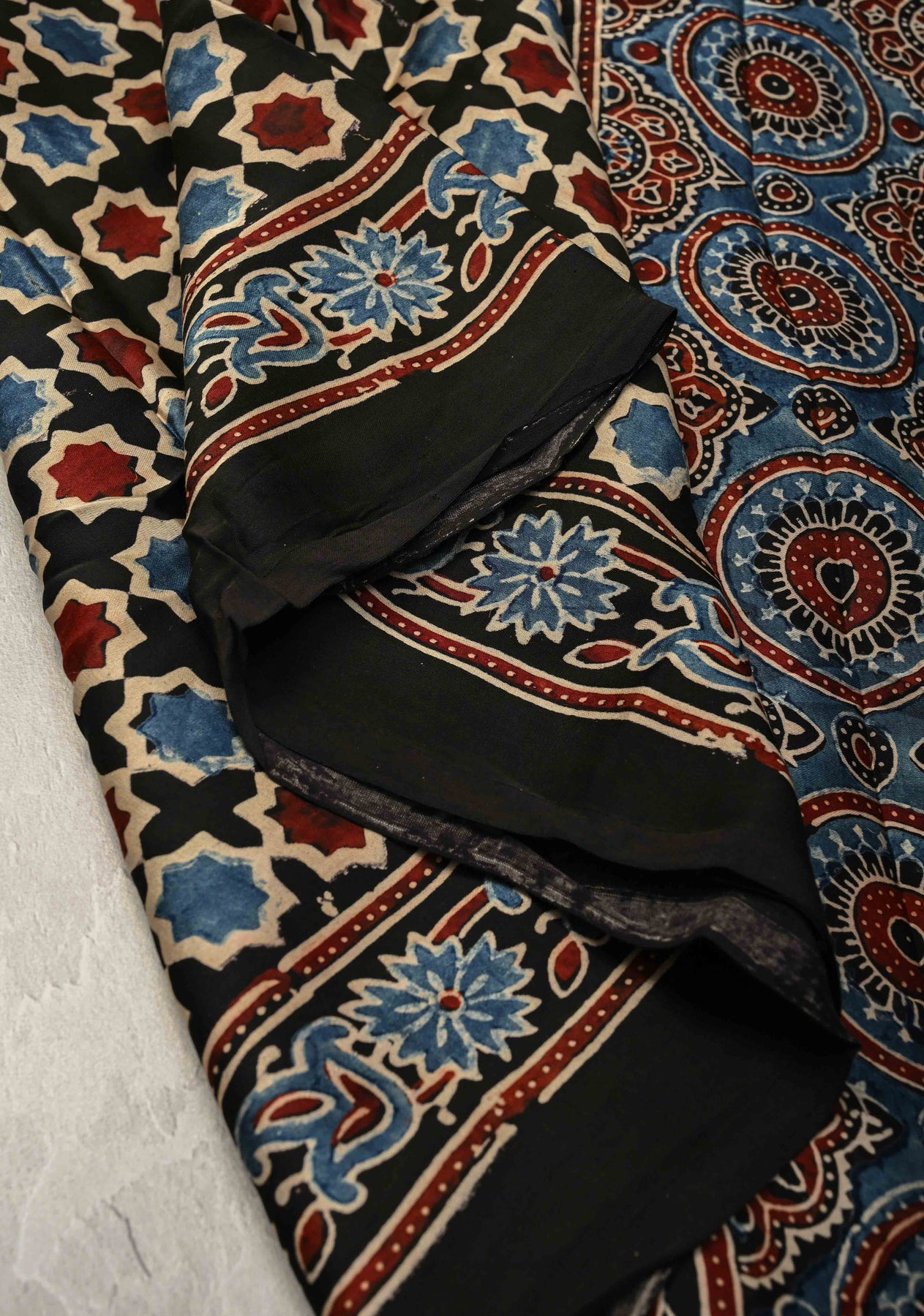 Immerse yourself in timeless tradition with this Black Modal Silk Saree, adorned with exquisite Ajrakh hand block prints a centuries-old craft known for its intricate geometric and floral motifs, deep natural hues, and labor-intensive process.