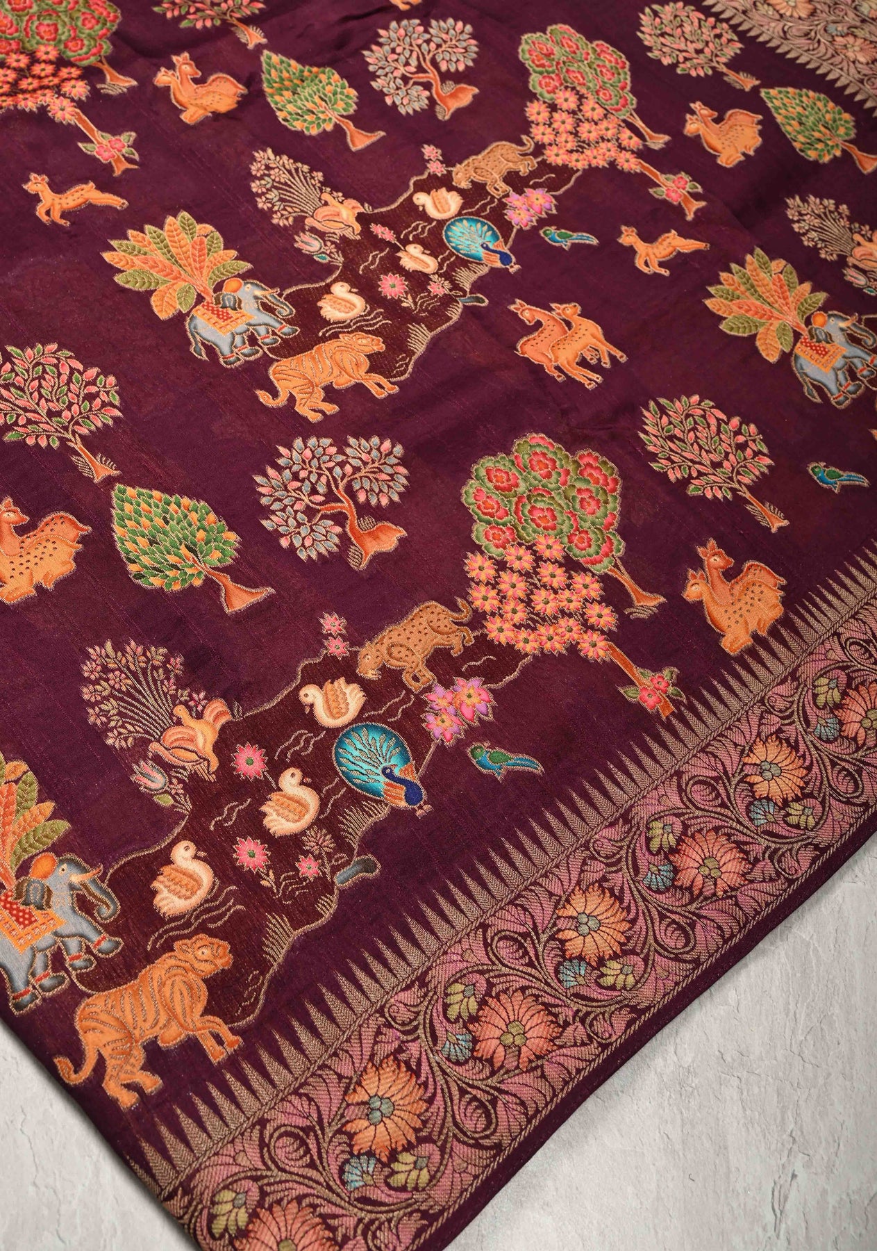 Plum Viscose Saree with Meenakari Shikaargah Brocade and Zari Border