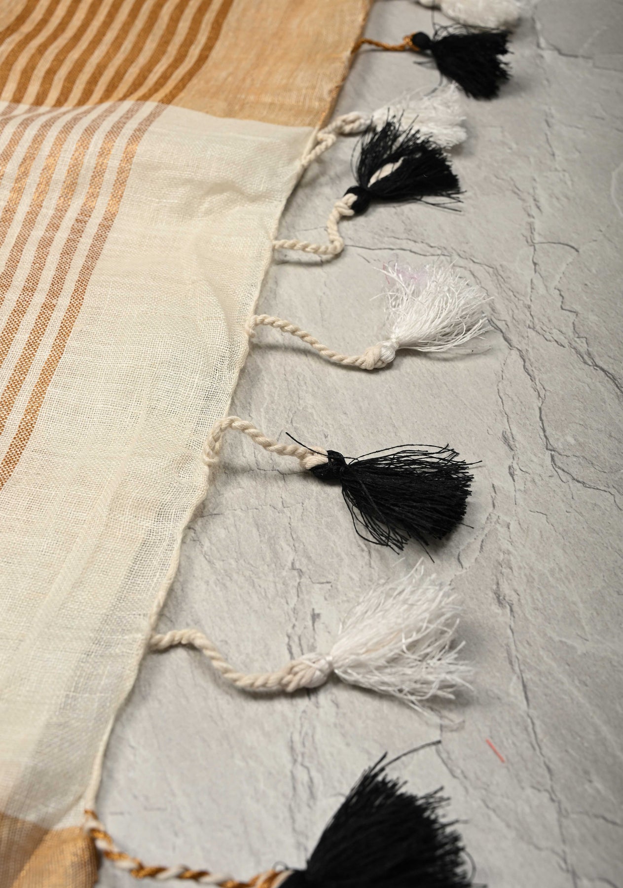 The saree is ready with fall and pico done. Long hand-knotted tassels line the pallu.