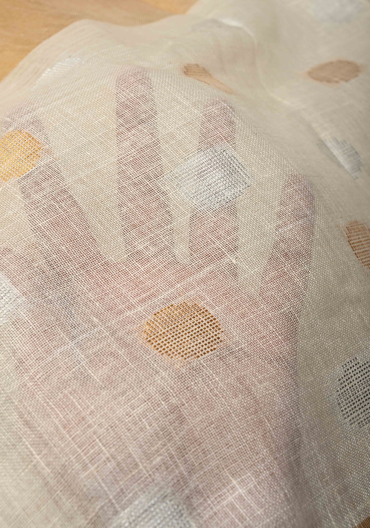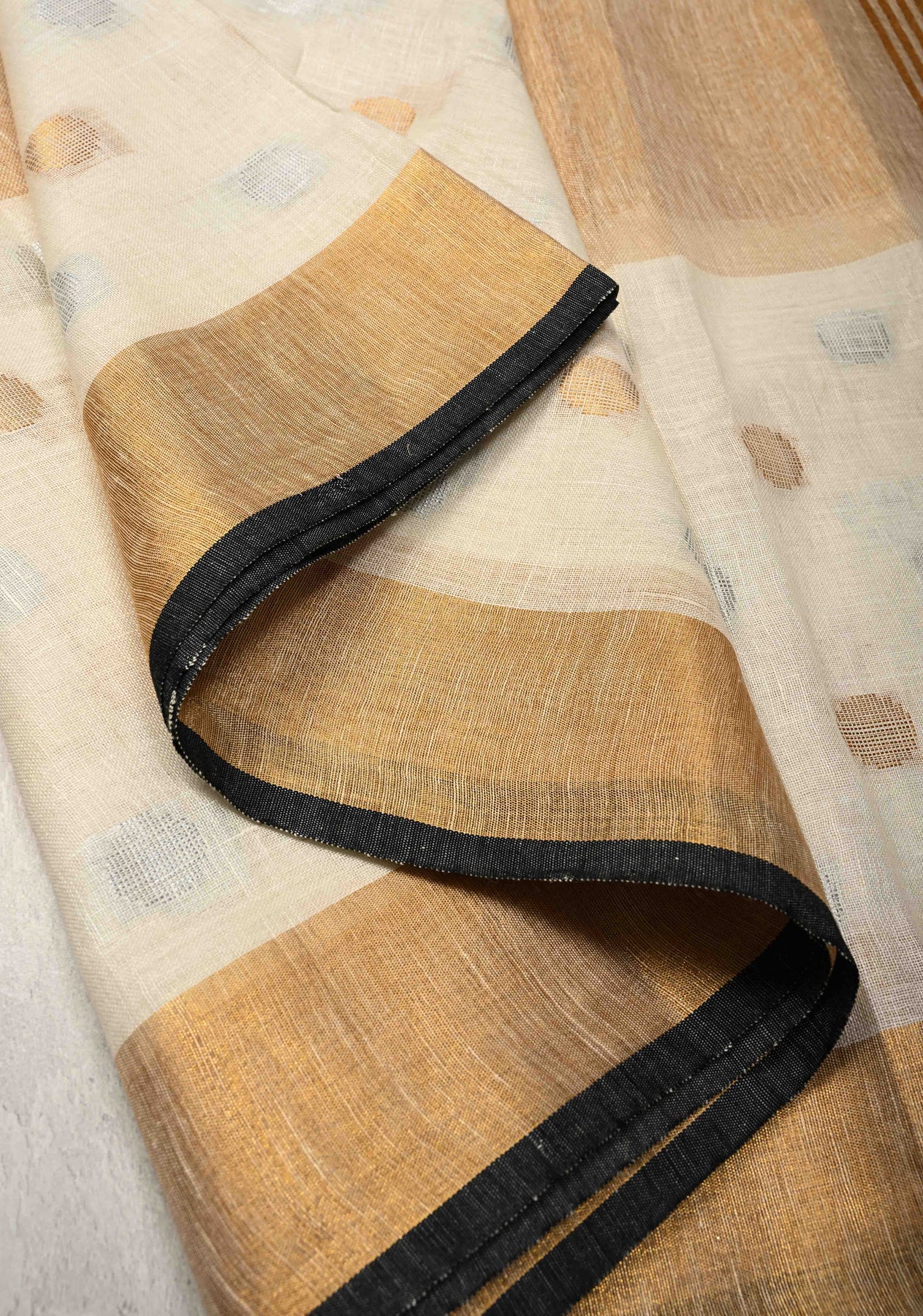 Experience understated elegance with this Gold Tissue Body Linen Saree in White, featuring a delicate shimmer that complements its lightweight linen base. Adorned with exquisite Sona Rupa polka dots throughout, the saree showcases subtle metallic accents that catch the light gracefully. The unique skirt-style zari border adds a refined touch, enhancing the saree’s classic appeal. Perfect for daytime events, festive occasions, or sophisticated gatherings, this saree combines traditional artistry with modern simplicity for a timeless look.
