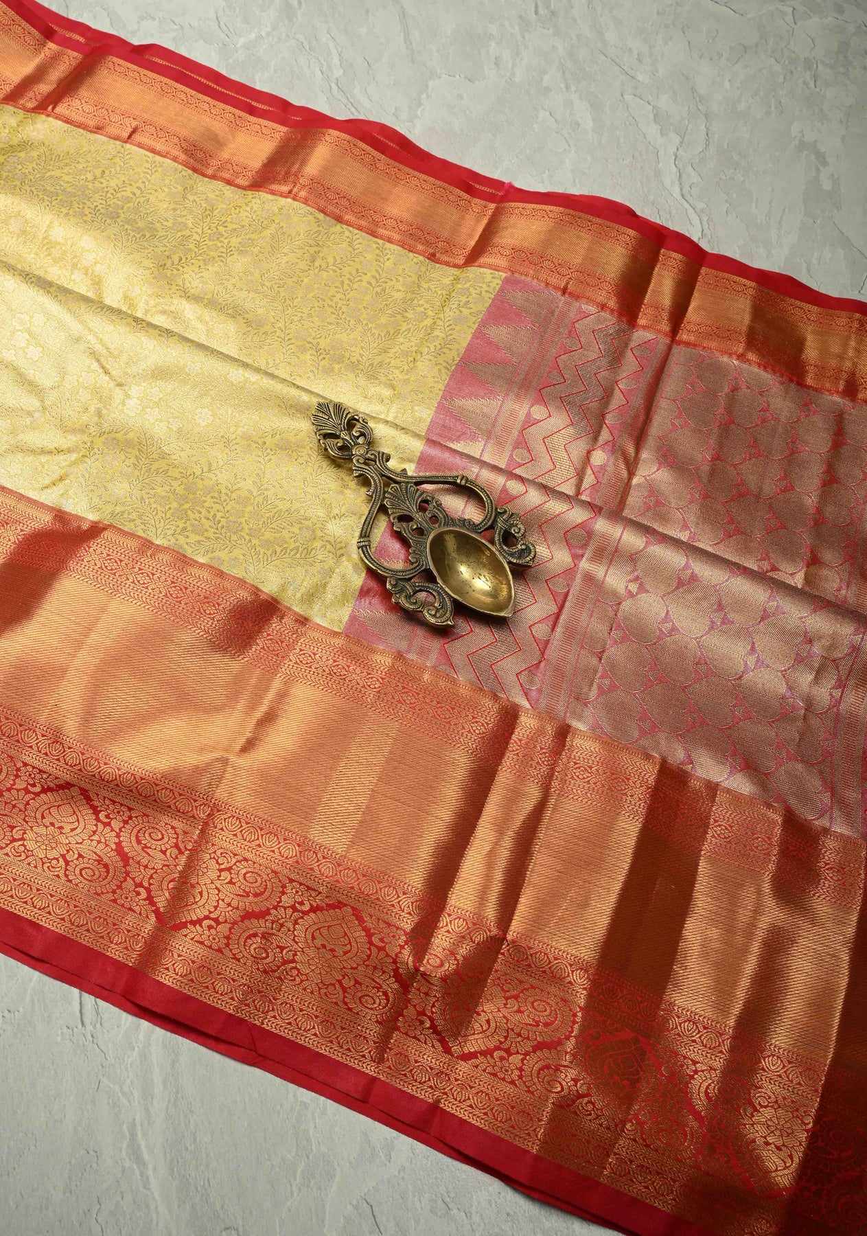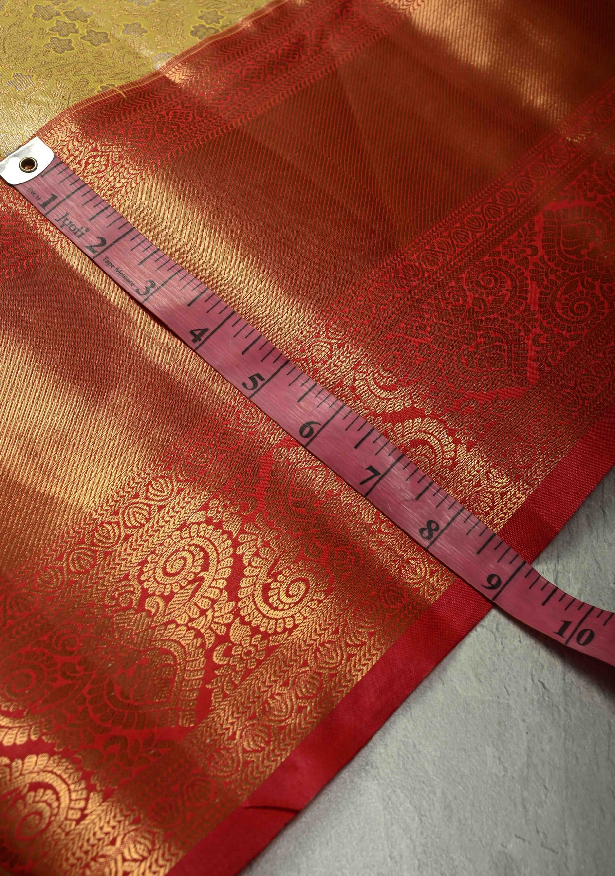 Illuminate any occasion with this vibrant Lemon Yellow Kanjivaram Saree. The luminous tissue semi-silk fabric creates a shimmering, lightweight drape, making a joyful statement. The body is entirely covered in an intricate Meenakari Floral Brocade Jaal, where detailed floral motifs are masterfully woven in fine zari and colorful silk threads. This exquisite artistry is beautifully framed by a bold, Contrast Wide Zari Border, which adds the traditional weight and opulence Kanjivaram is known for. This piece is a perfect, striking choice for haldi ceremonies, festive daytime events, and wedding celebrations.