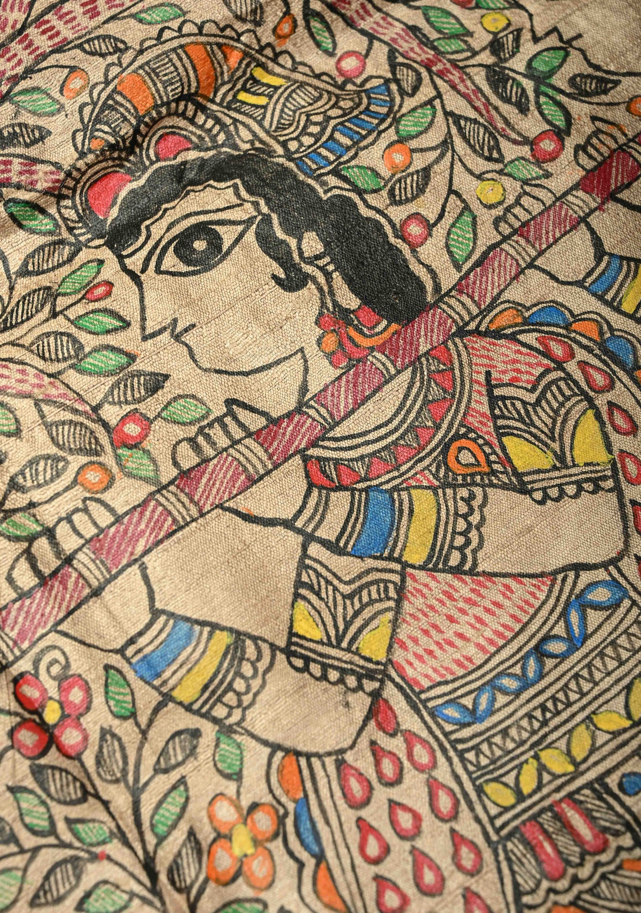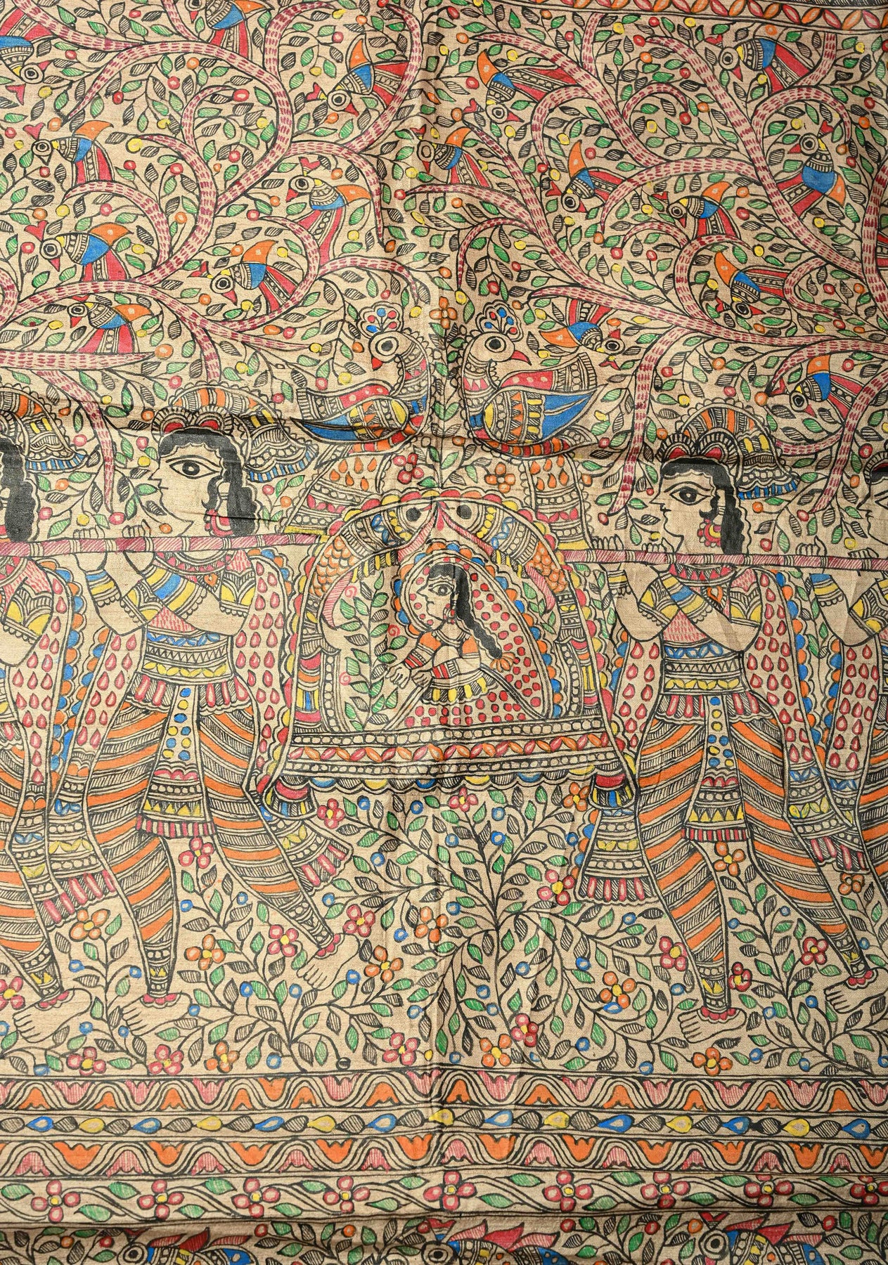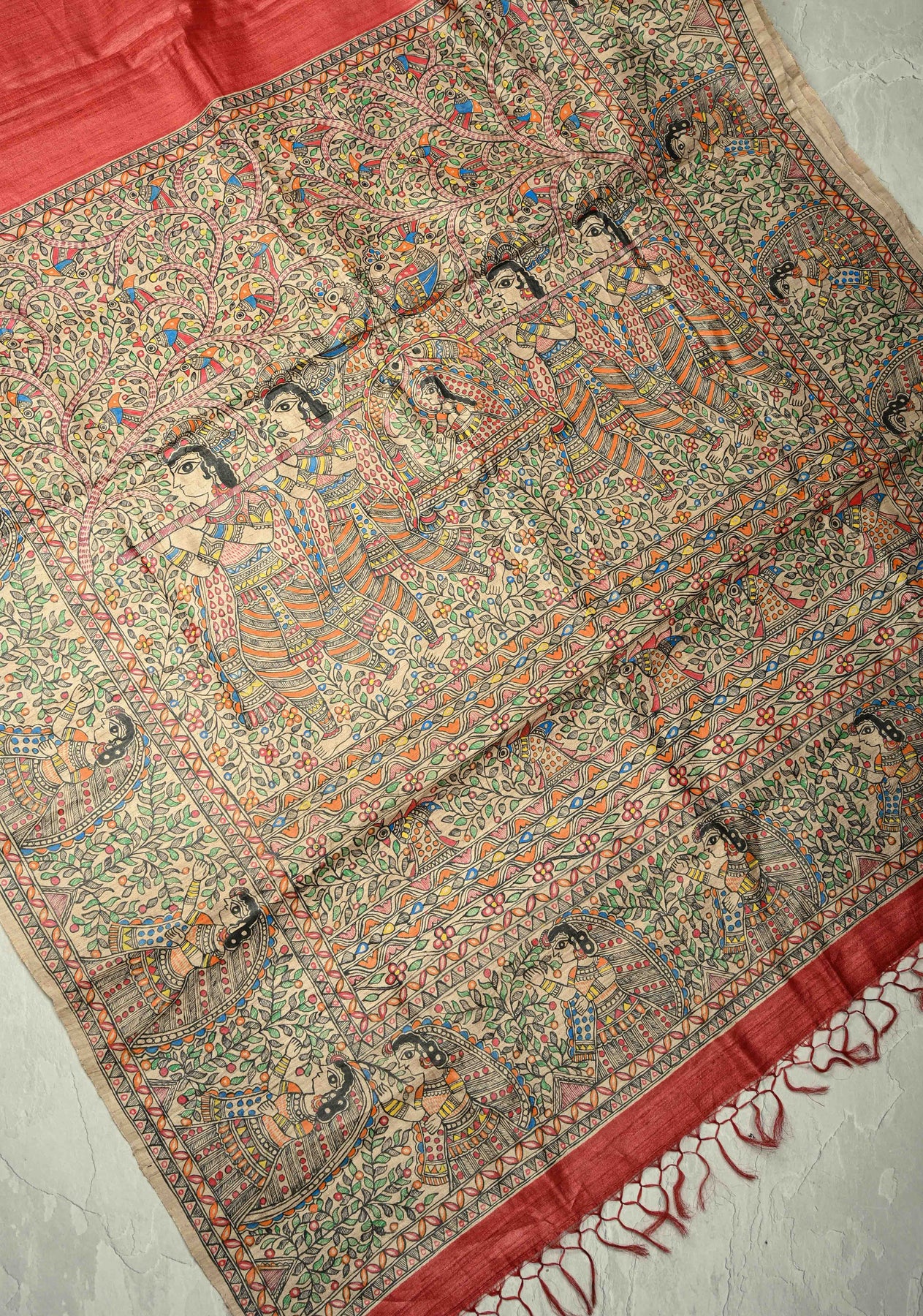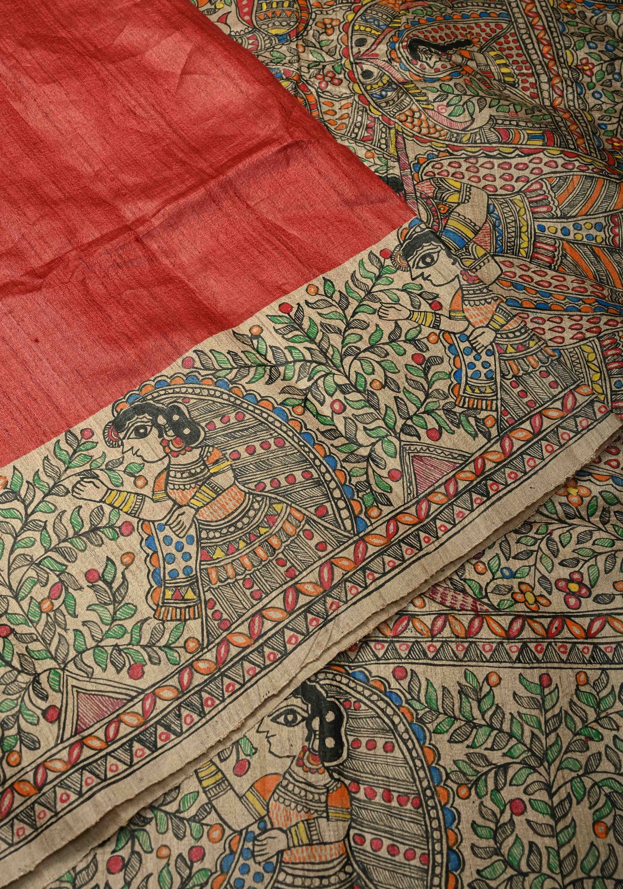Red Handloom Tussar Silk saree with Hand Painted Madhubani Border | SILK MARK CERTIFIED