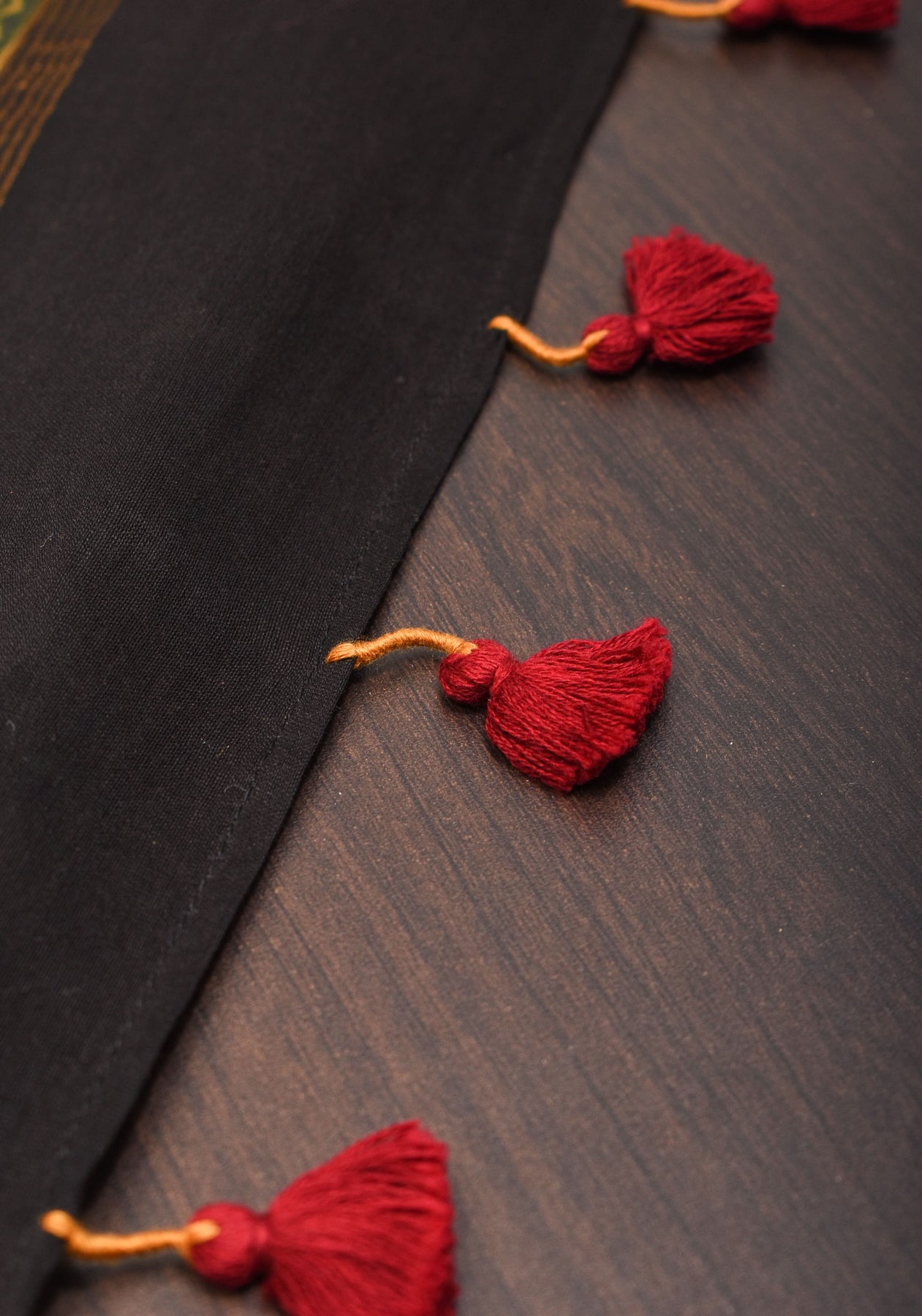 The saree is ready to wear with falls and pico done. An unstitched blouse fabric is included.