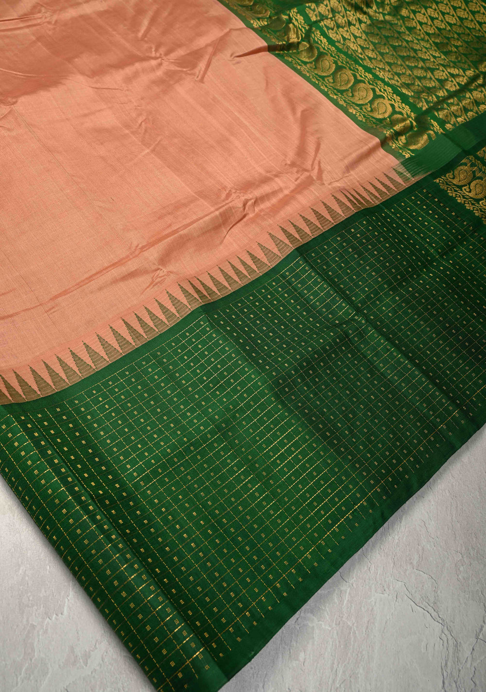 This Sandstone Kanchi Silk Cotton Saree beautifully blends earthy tones with timeless elegance. The terracotta body is adorned with delicate zari buttas, adding a subtle shimmer, while intricate zari checks lend texture and traditional charm. Crafted from a soft silk-cotton blend, the saree drapes gracefully and feels comfortable for all-day wear. A bold contrast zari border frames the saree with a regal finish, making it an ideal choice for festive occasions, poojas, and cultural gatherings.