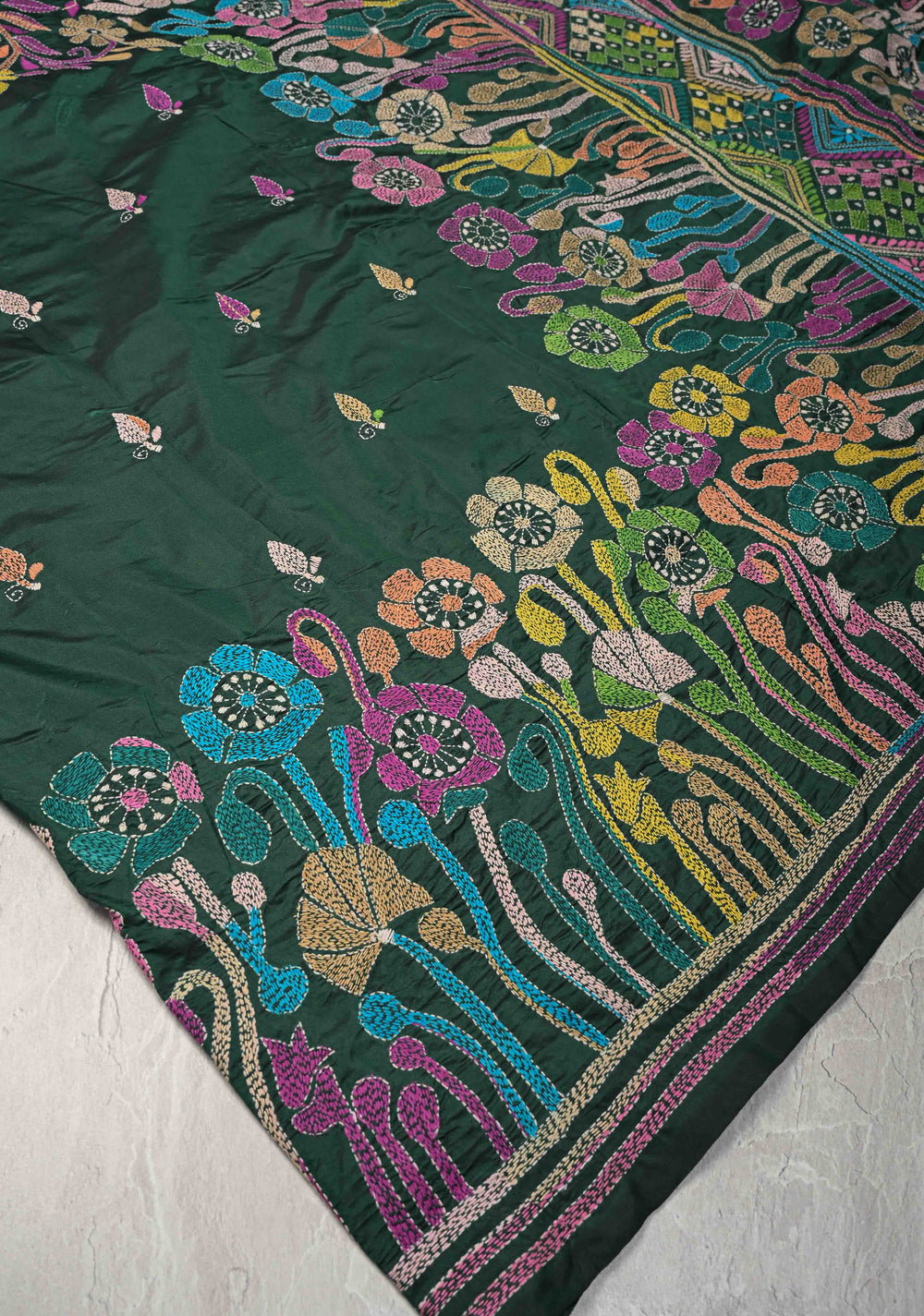 Emerald Green Art Silk Saree with Kantha Hand Embroidery Design