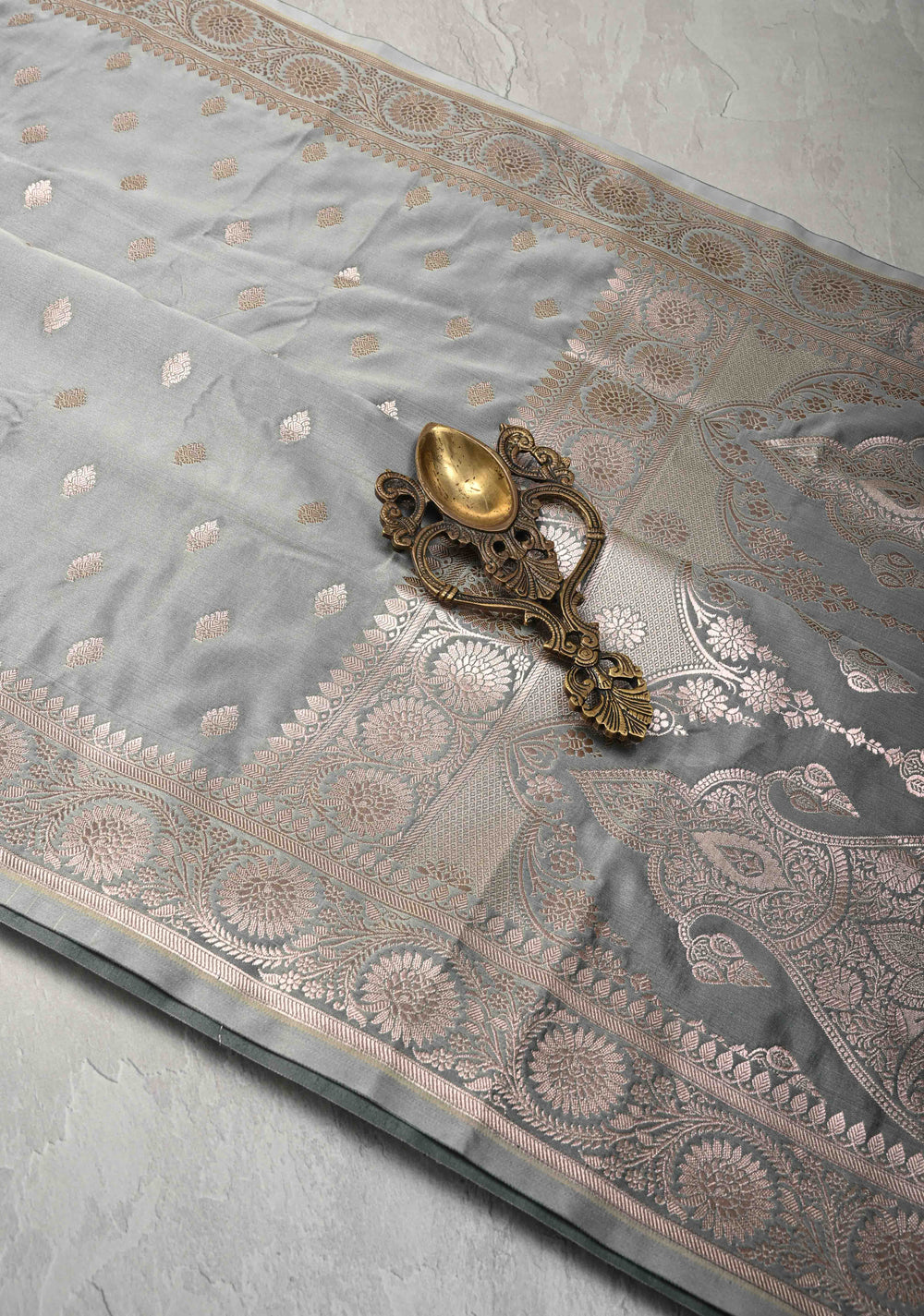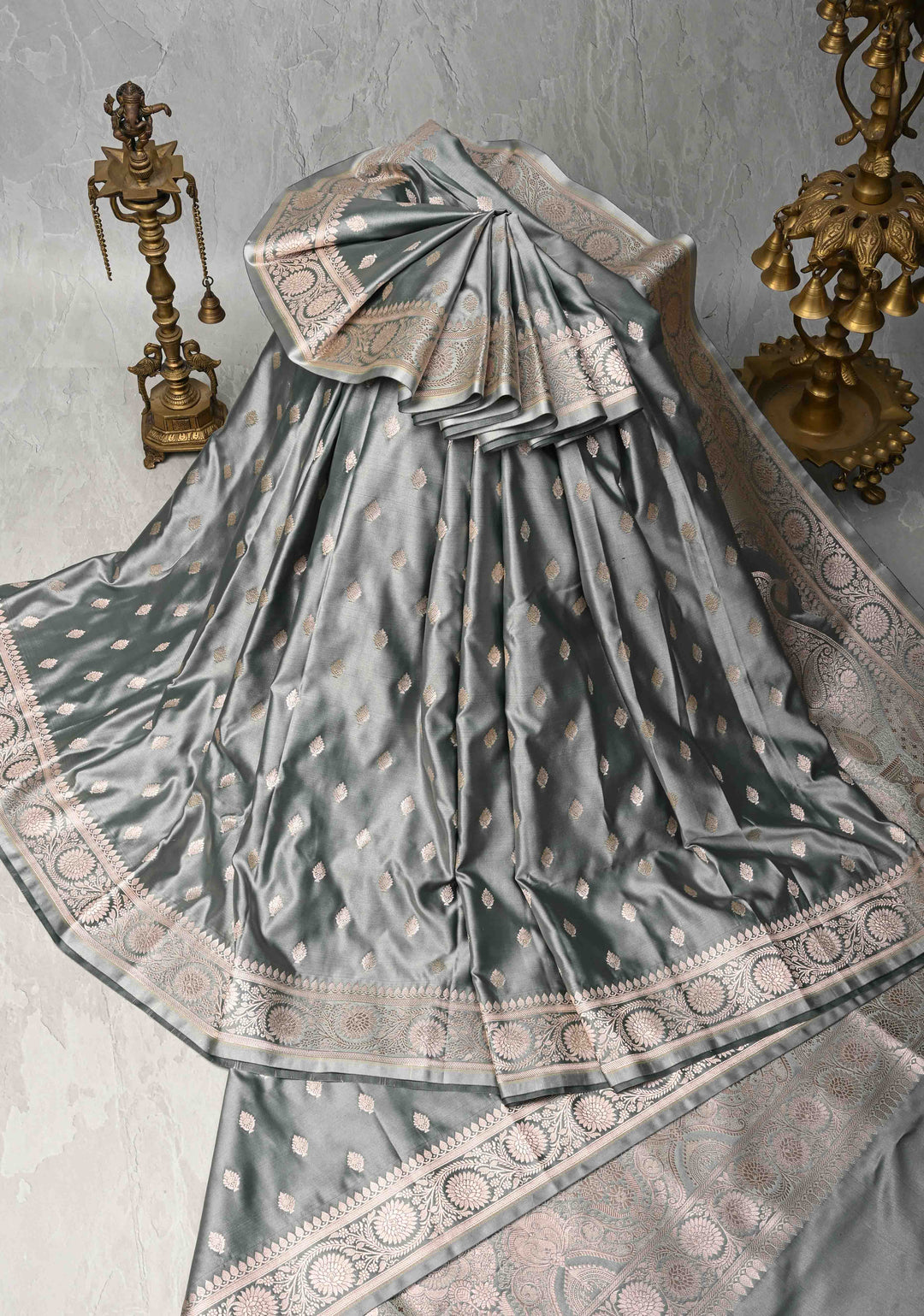 Gray Banarasi Katan silk saree with Meenakari Zari Buttas and Contrast Zari Border | SILK MARK CERTIFIED