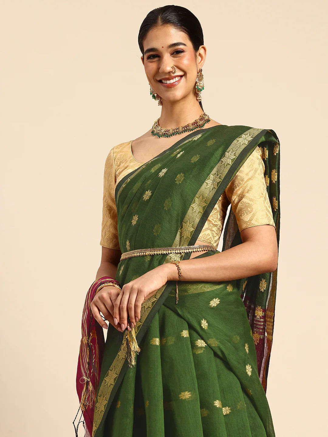 Pista Green & Magenta Zari Buti Silk Cotton Saree with blouse piece