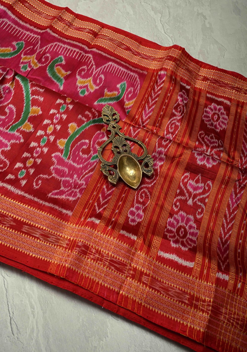 Pink-Red Handloom Sambalpuri Ikkat Silk Saree with Ikkat Weave and Zari Border, No Blouse Piece | SILK MARK CERTIFIED