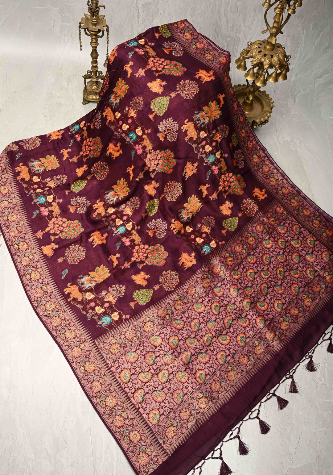 Plum Viscose Saree with Meenakari Shikaargah Brocade and Zari Border