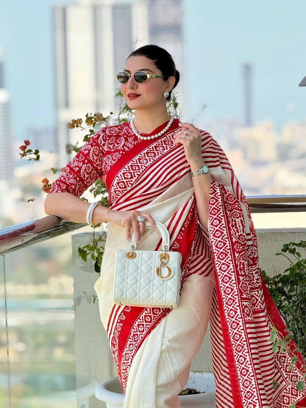 Off White and Red Linen by Linen Saree with thread Buttas