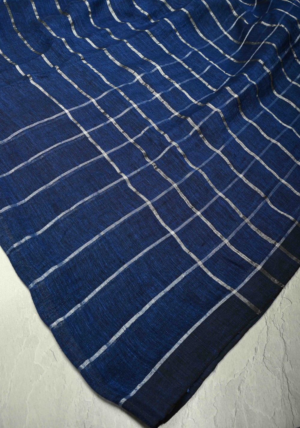 Royal Blue Linen by Cotton Saree with Silver Zari Stripes