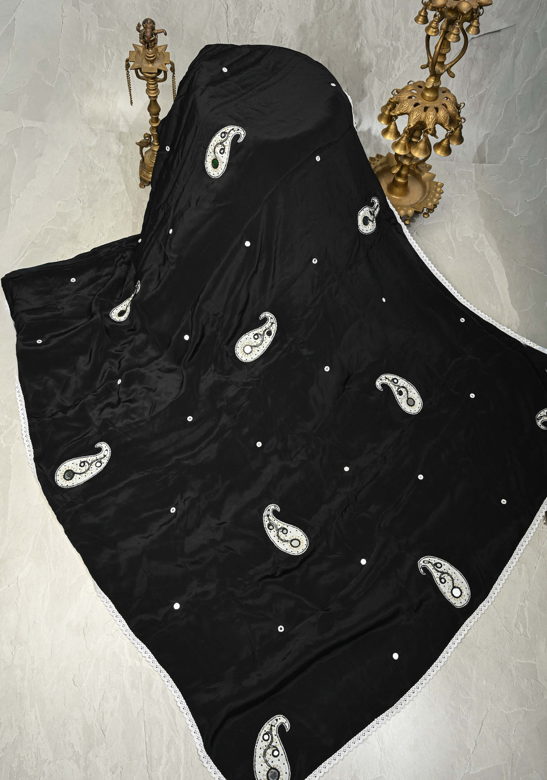 Black Modal Silk Saree with Hand Crafted Cutdana, Sequins and Moti,Mirror Work In Paisley Design With Lace Border