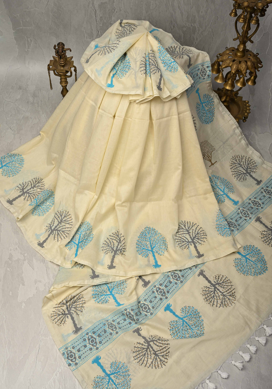 Cream Uppada Handloom Cotton Saree with Tree of life Block Prints on Border and Pallu