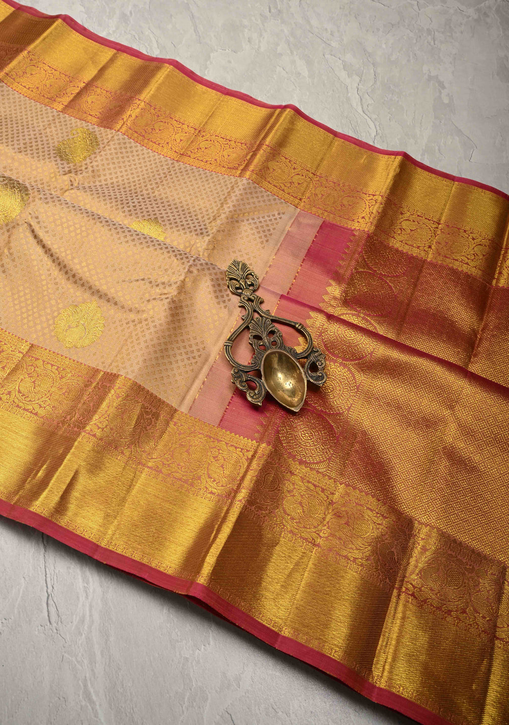 Sandstone Borderless Pure Kanjivaram Silk Saree with Gold-Silver Life of Tree Motifs | SILK MARK CERTIFIED