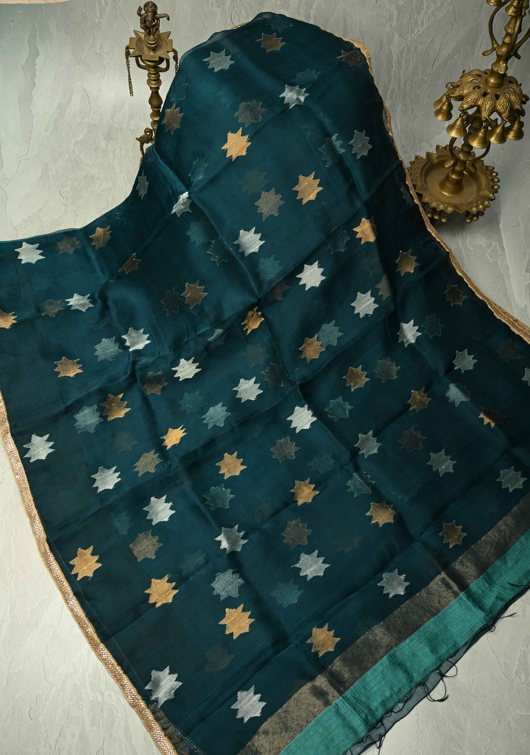 Pocket Sequins Woven on Pure Matka Muslin Saree in Dark Teal and Minimal Zari Border