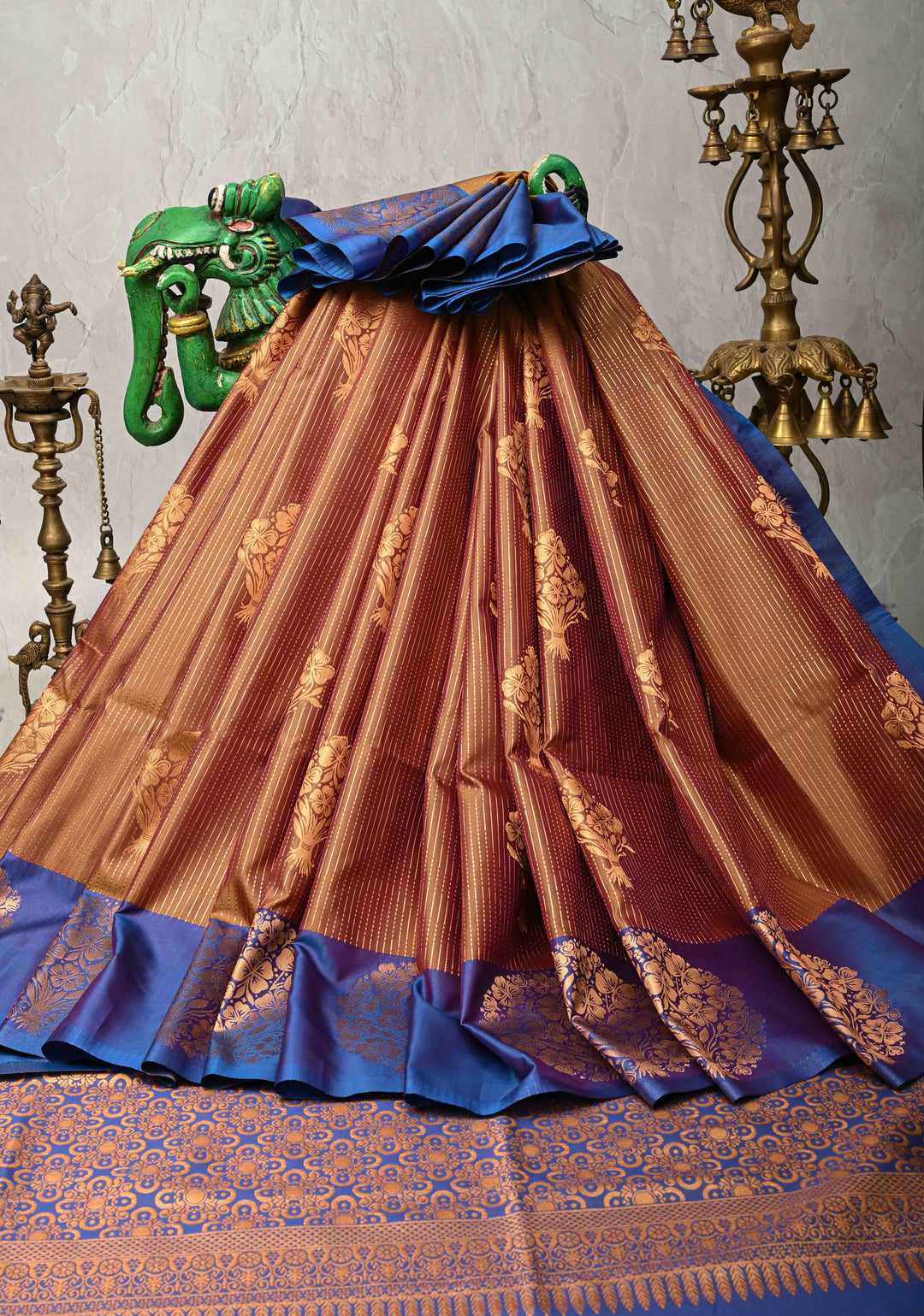 Brown Dual Tone Kanchi Semi Silk Saree with Vertical Stripes Zari Buttas and Contrst Zari Border