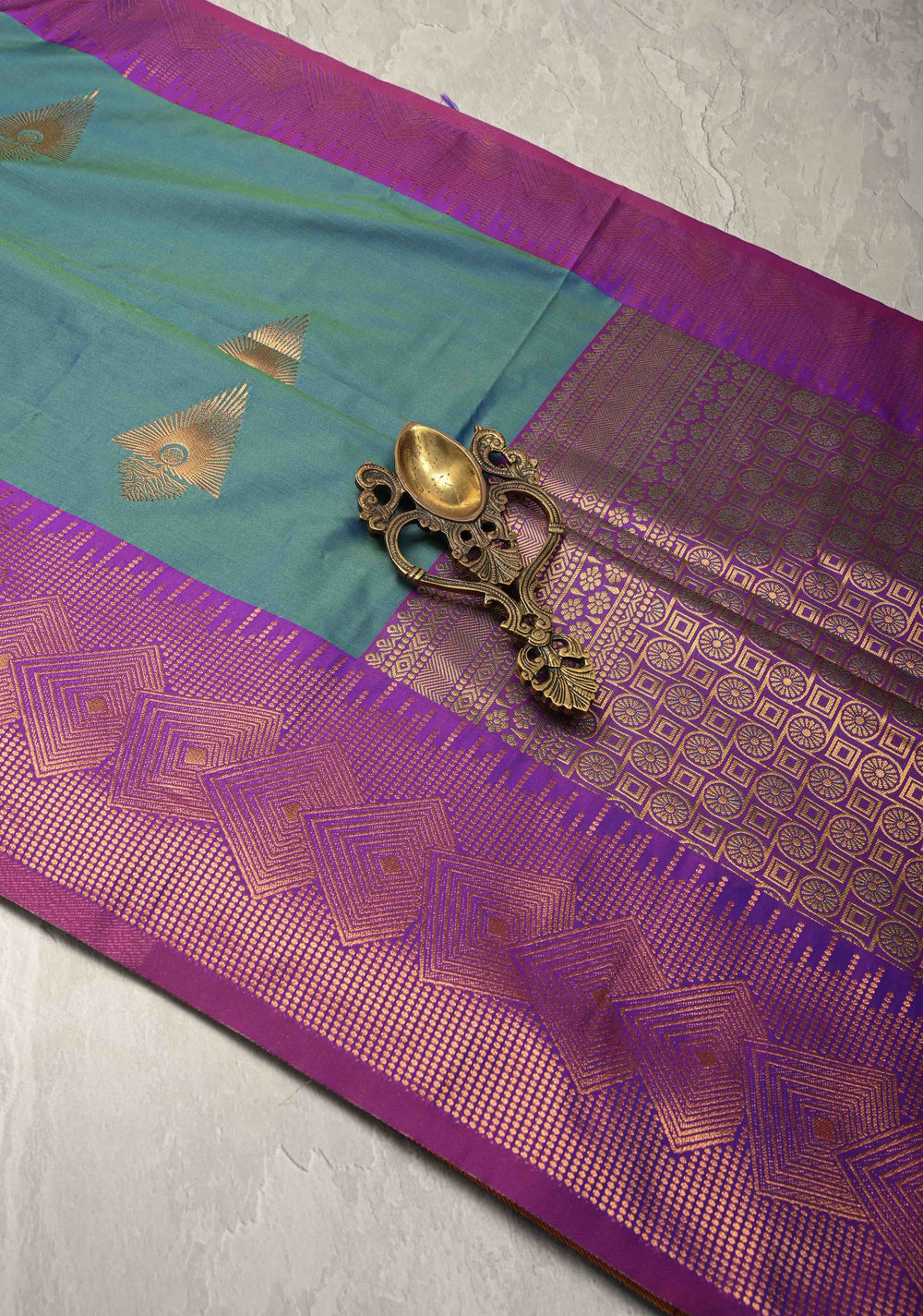 Peacock Blue Dual tone Kanchi Semi Silk Saree with Paisley Zari Buttas and Geomatric Motifs on Border