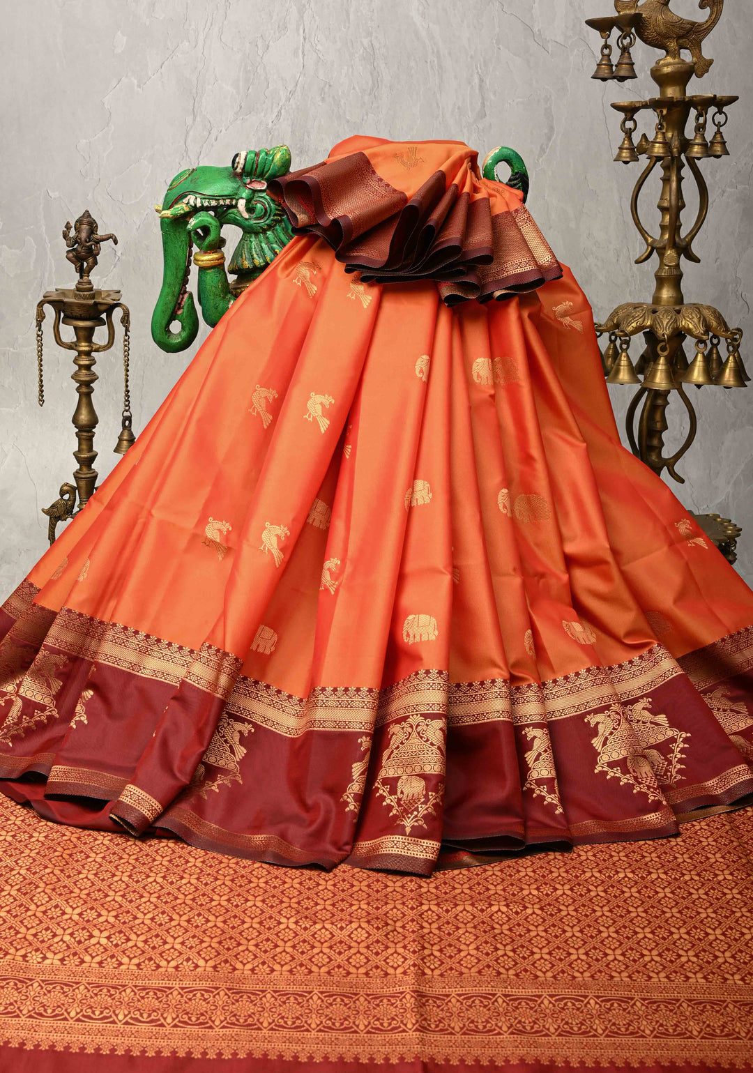 Orange Kanchi Semi Silk Saree with Elephant-Peacock Buttas and Distinct Motif Contrast Zari Border