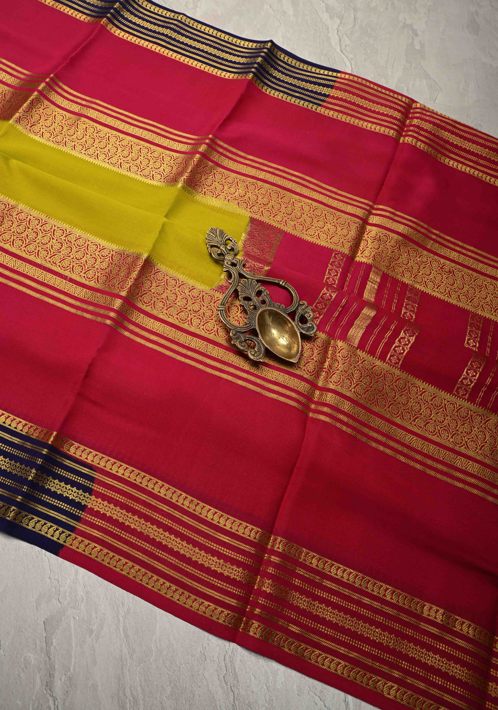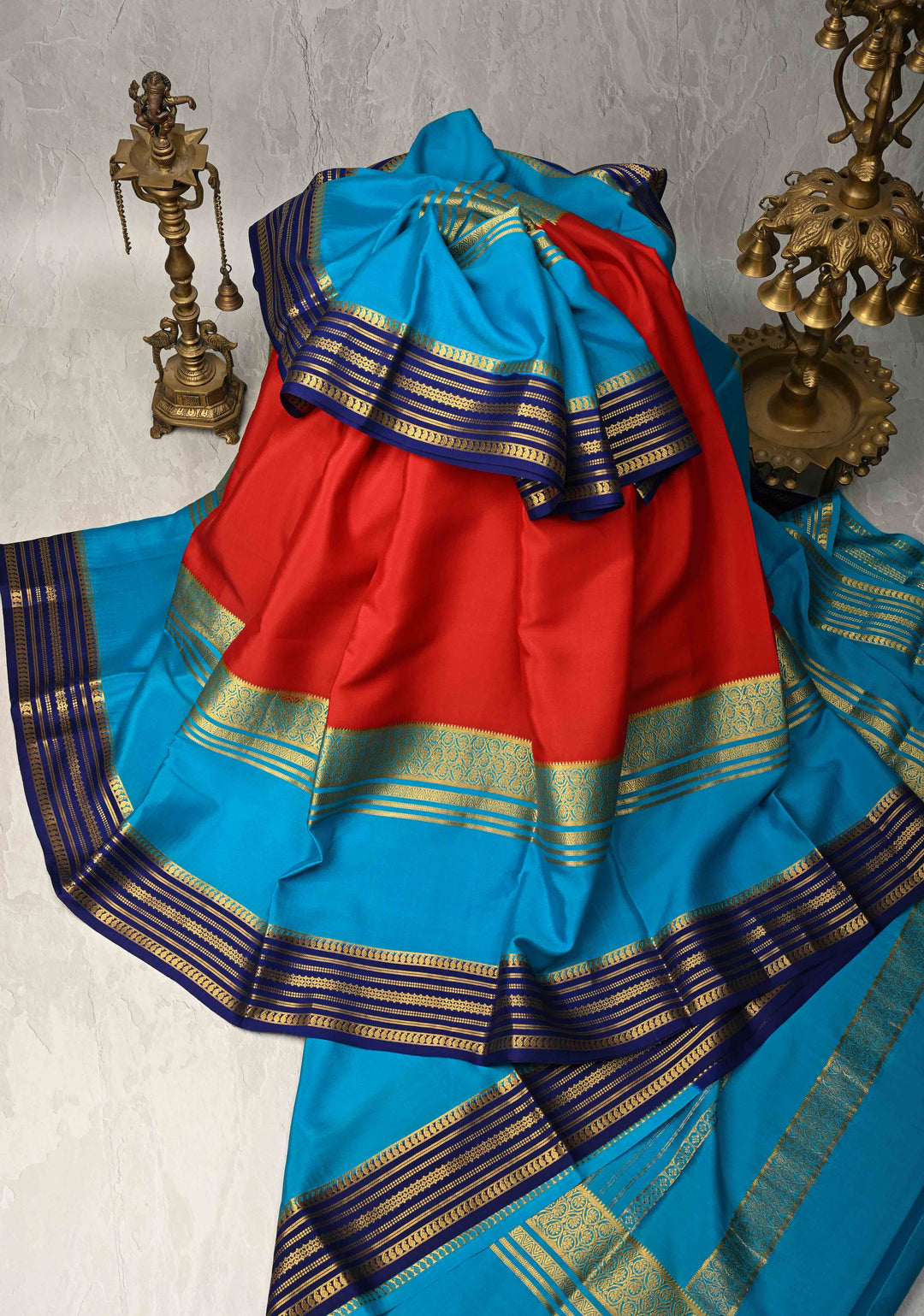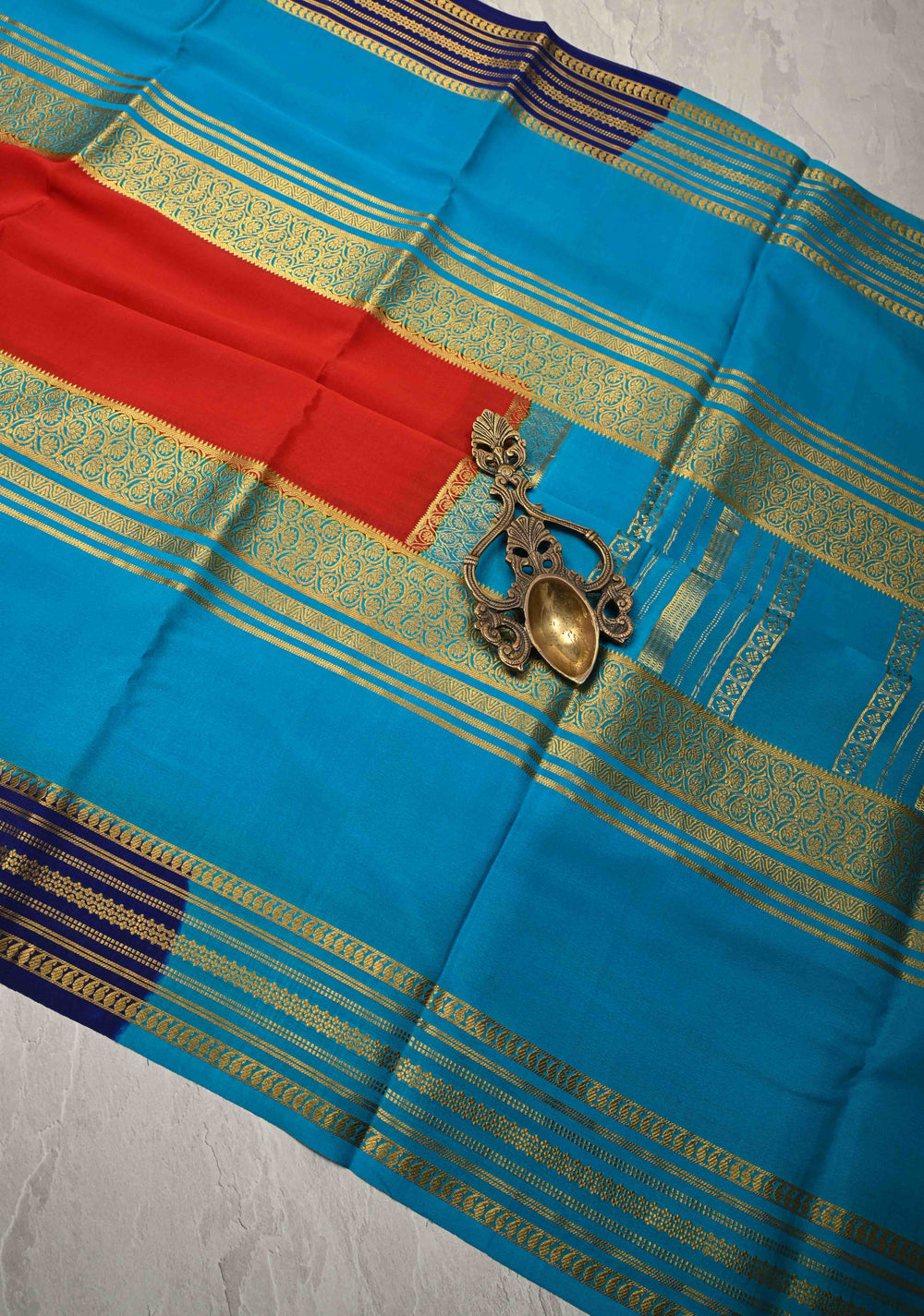 Carmine Red Mysore Silk Saree with Blue Panel and Zari Border in KSIC Grade Thickness | SILK MARK CERTIFIED