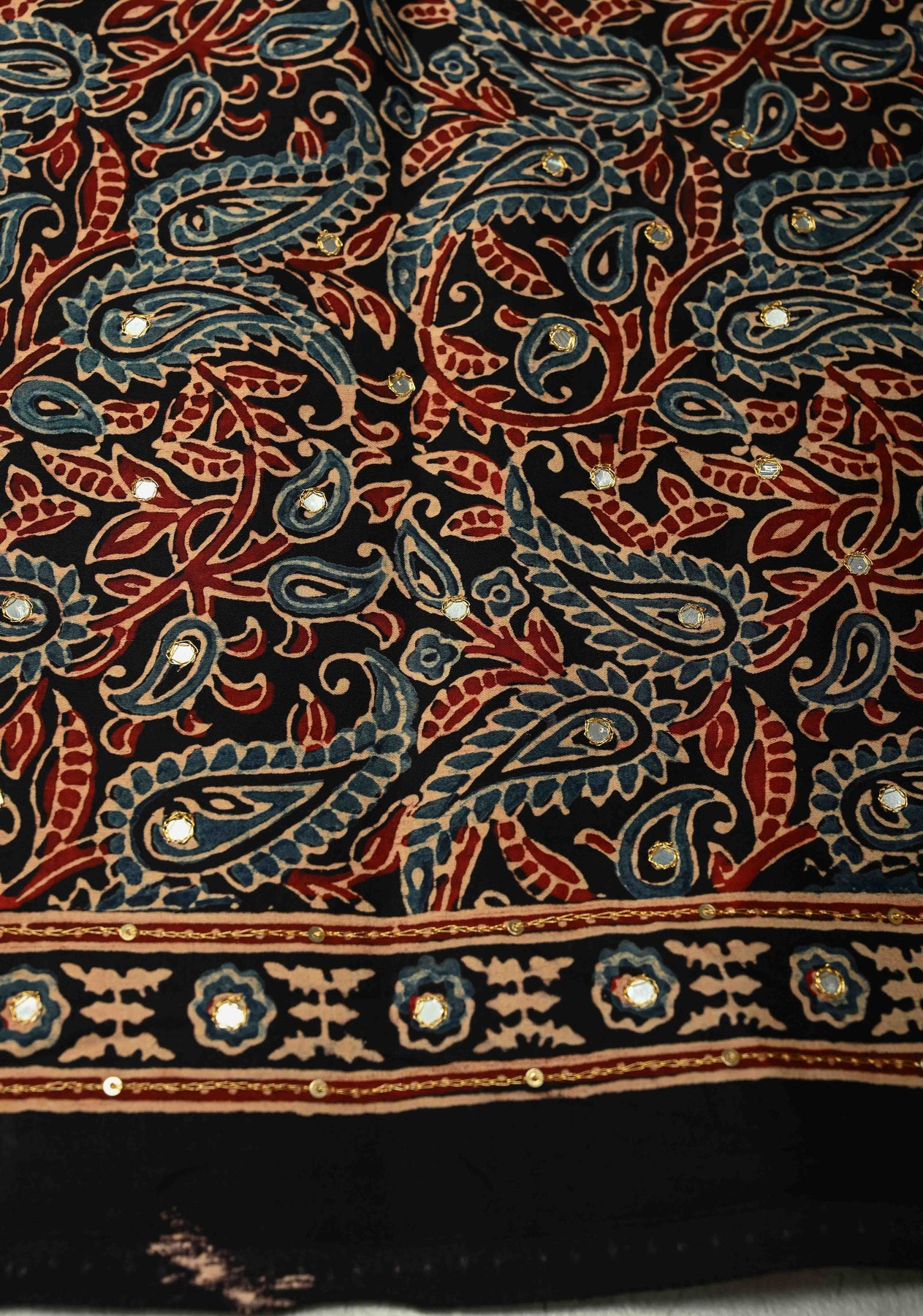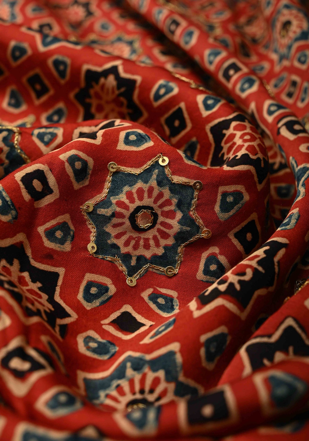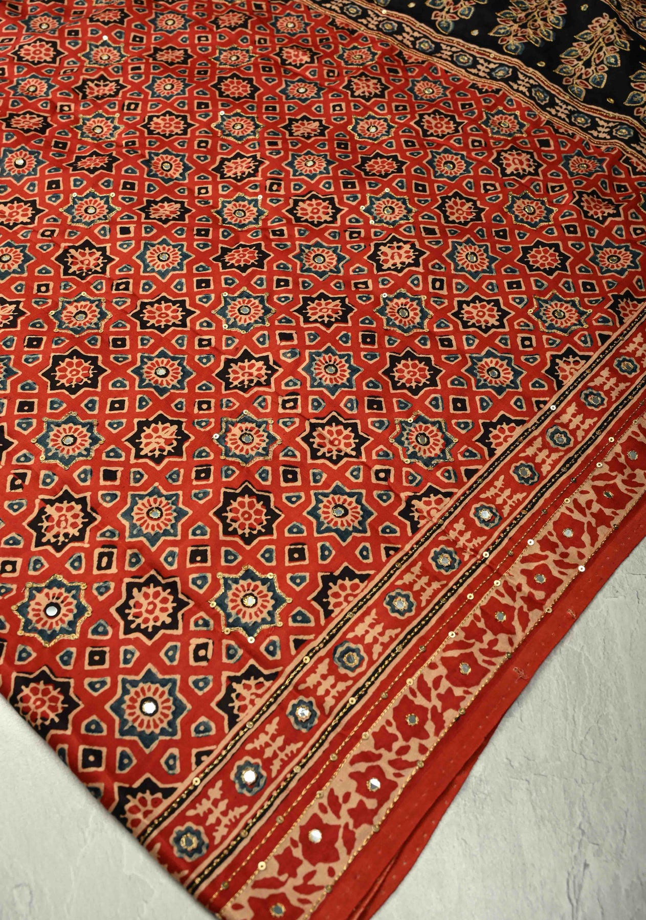 The Ajrakh Hand Block Print Red Modal Silk Saree is a stunning showcase of traditional craftsmanship blended with contemporary elegance. Crafted from soft, flowing modal silk, it drapes beautifully and offers a luxurious, comfortable feel. The saree features intricate Ajrakh hand block prints in red hues, highlighting geometric and floral motifs rooted in heritage art. Subtle Aari-mirror work adds a delicate shimmer, enhancing its artisanal charm. A contrasting black pallu provides a striking visual balance, giving the saree a sophisticated and modern edge. Ideal for festive occasions, weddings, and cultural events, this saree is a perfect blend of tradition and style.
