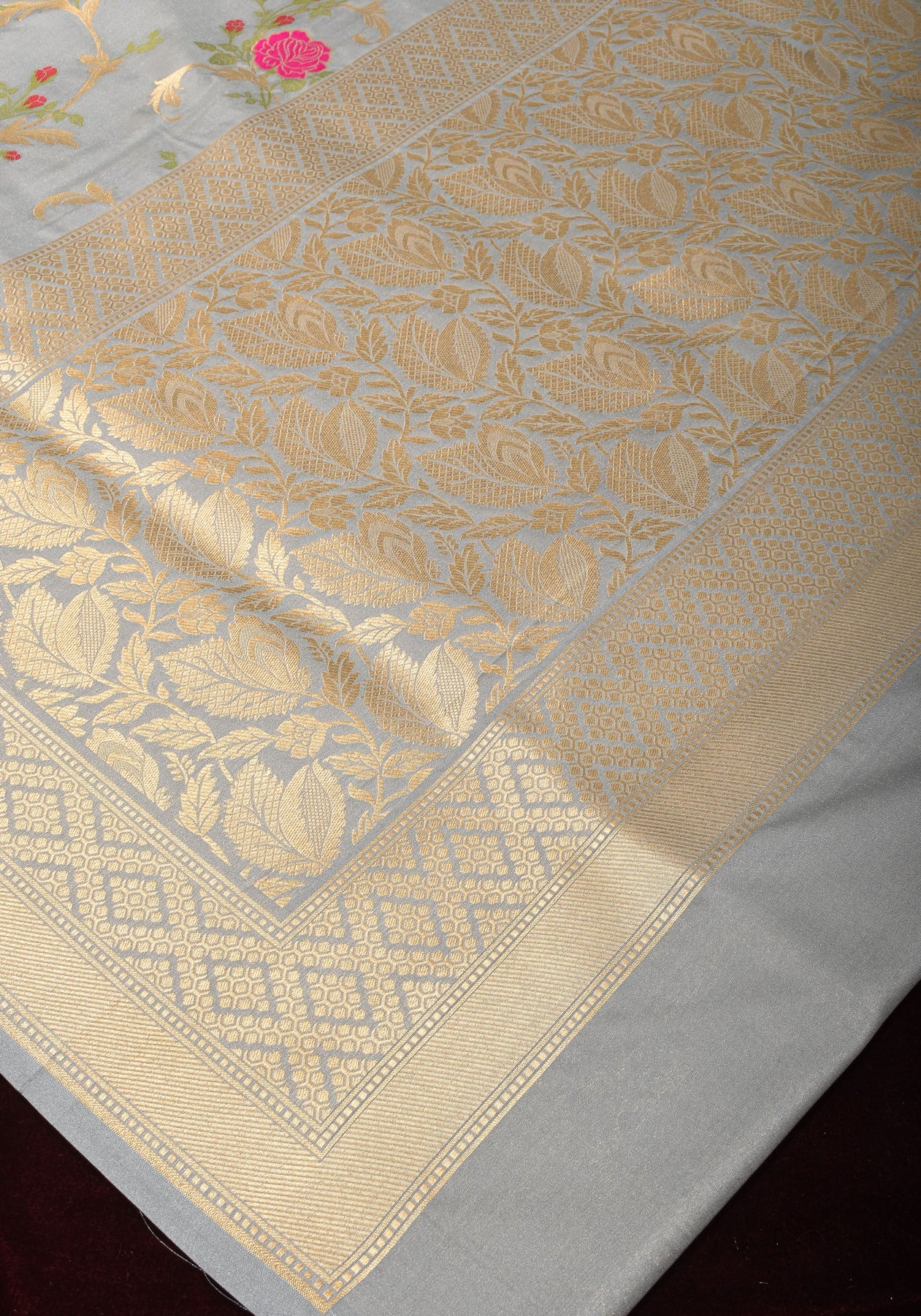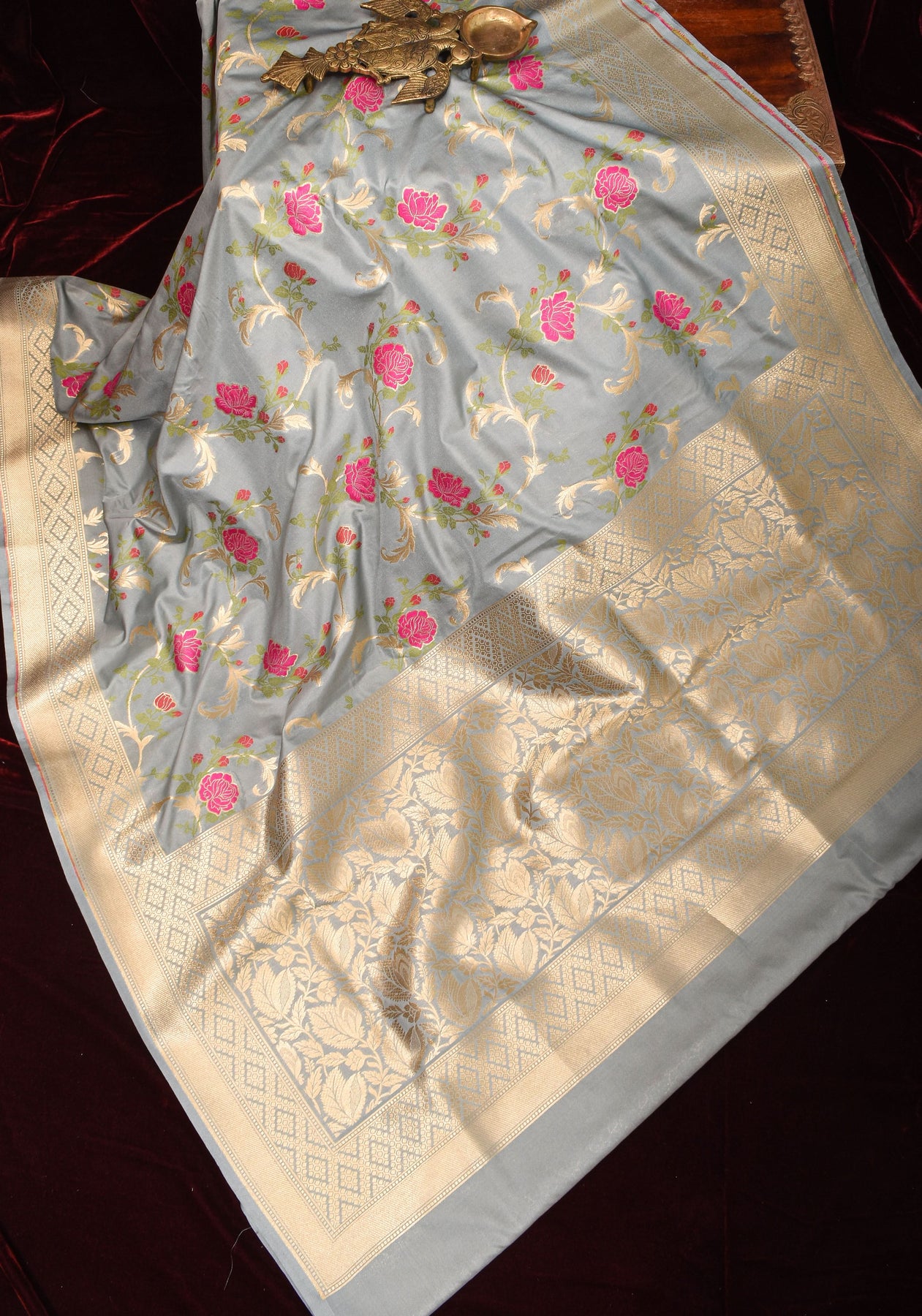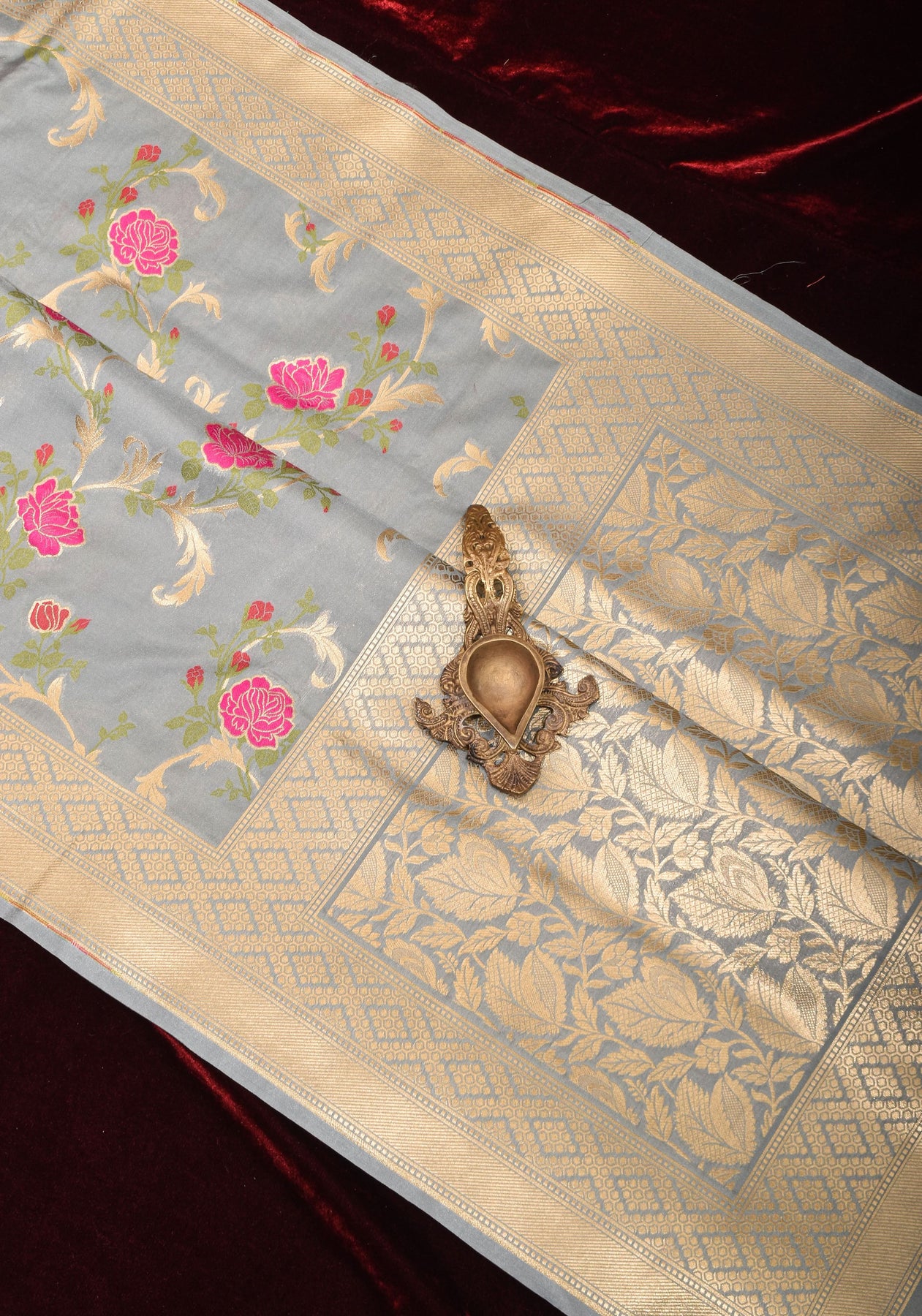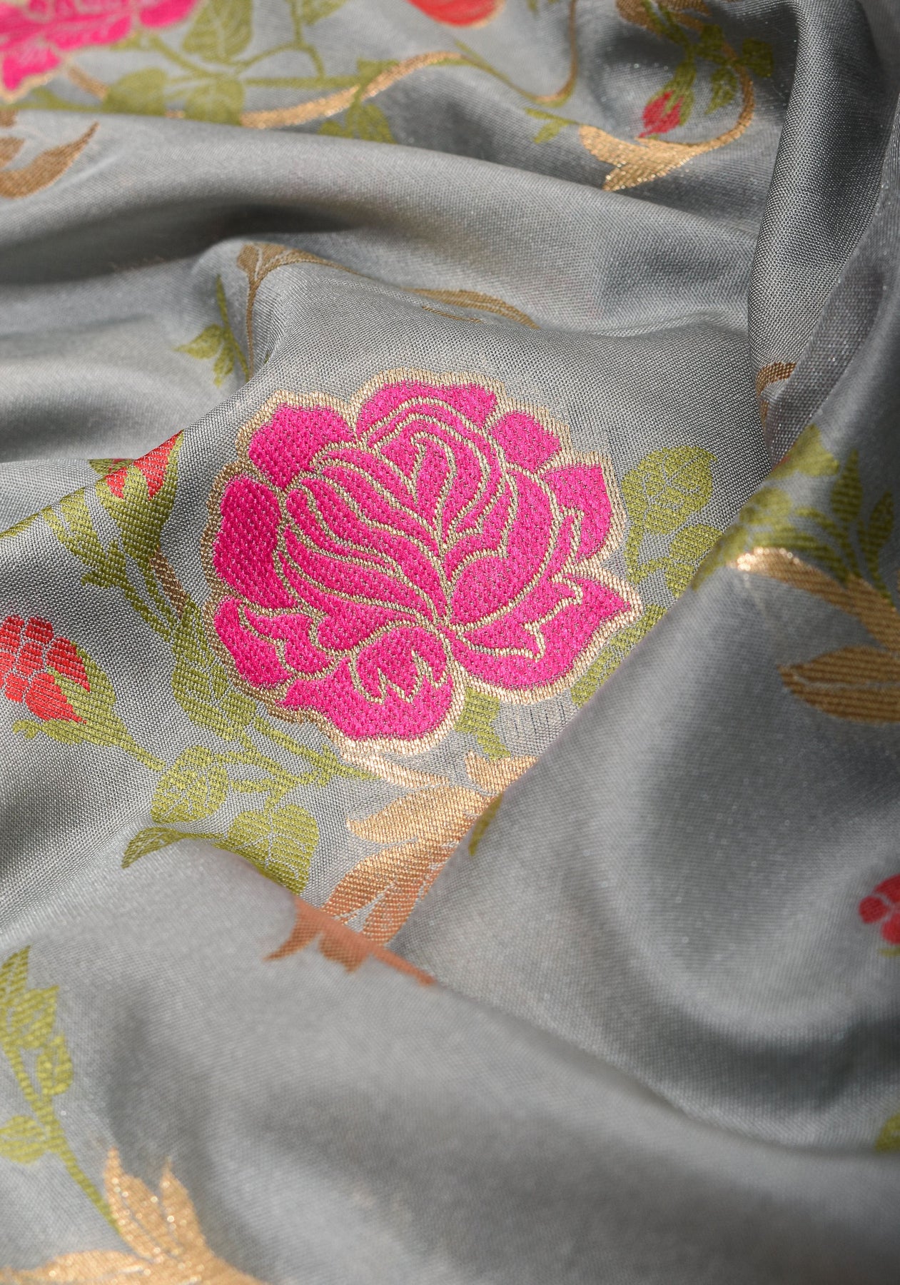 Unleash your inner radiance with this exquisite Semi Silk Saree! Skillfully crafted with vibrant meenakari Rose vines jaal design, this gorgeous garment showcases dual-toned rose flowers and a zari border and pallu.