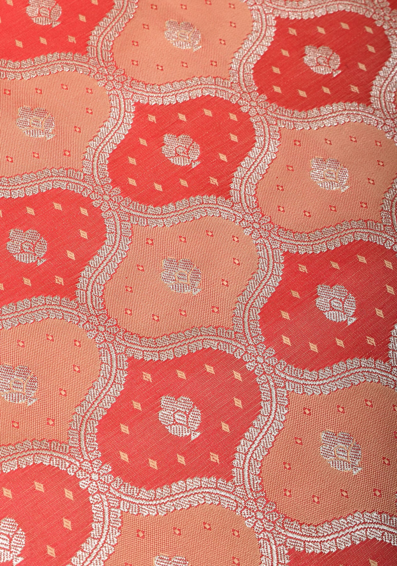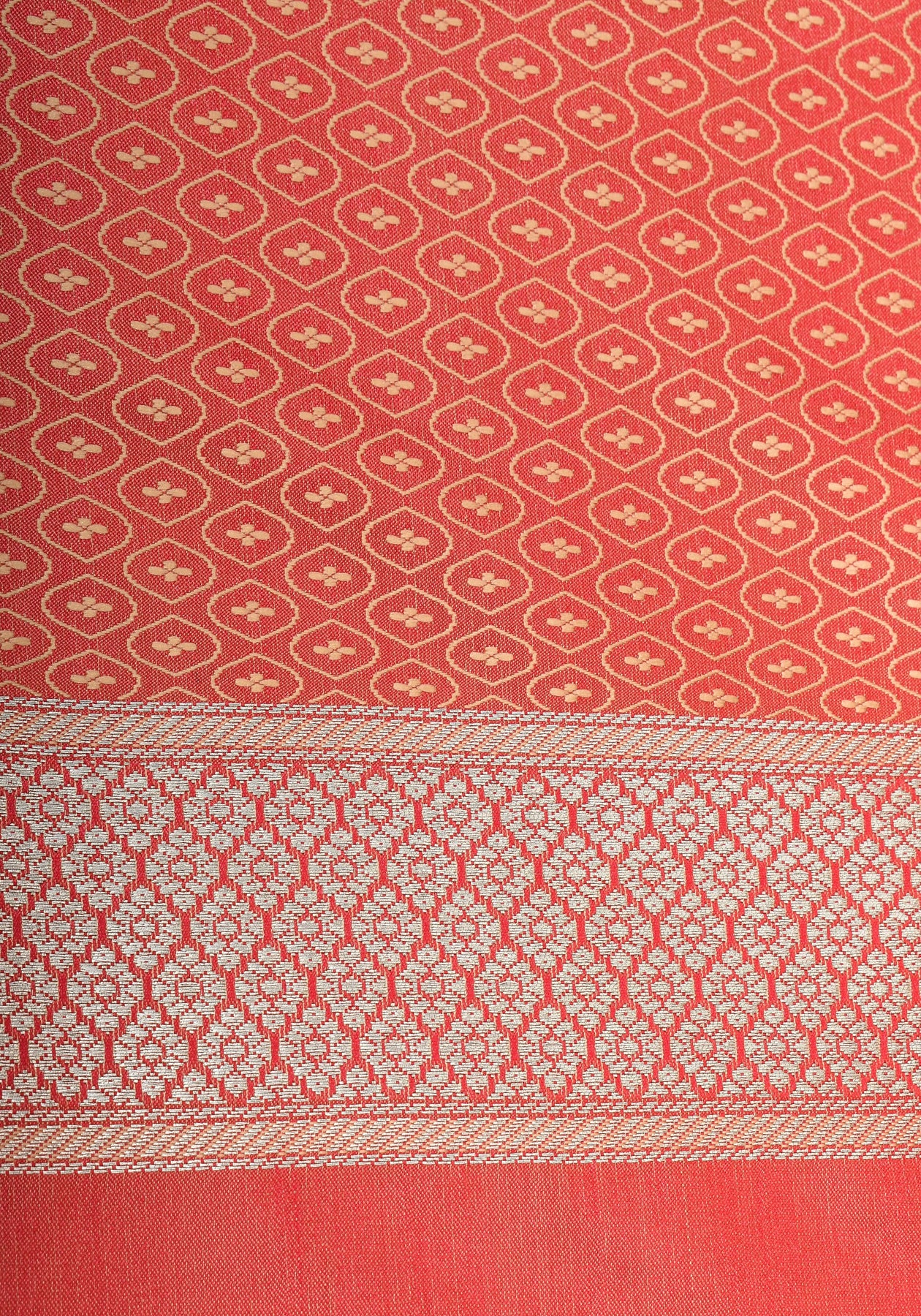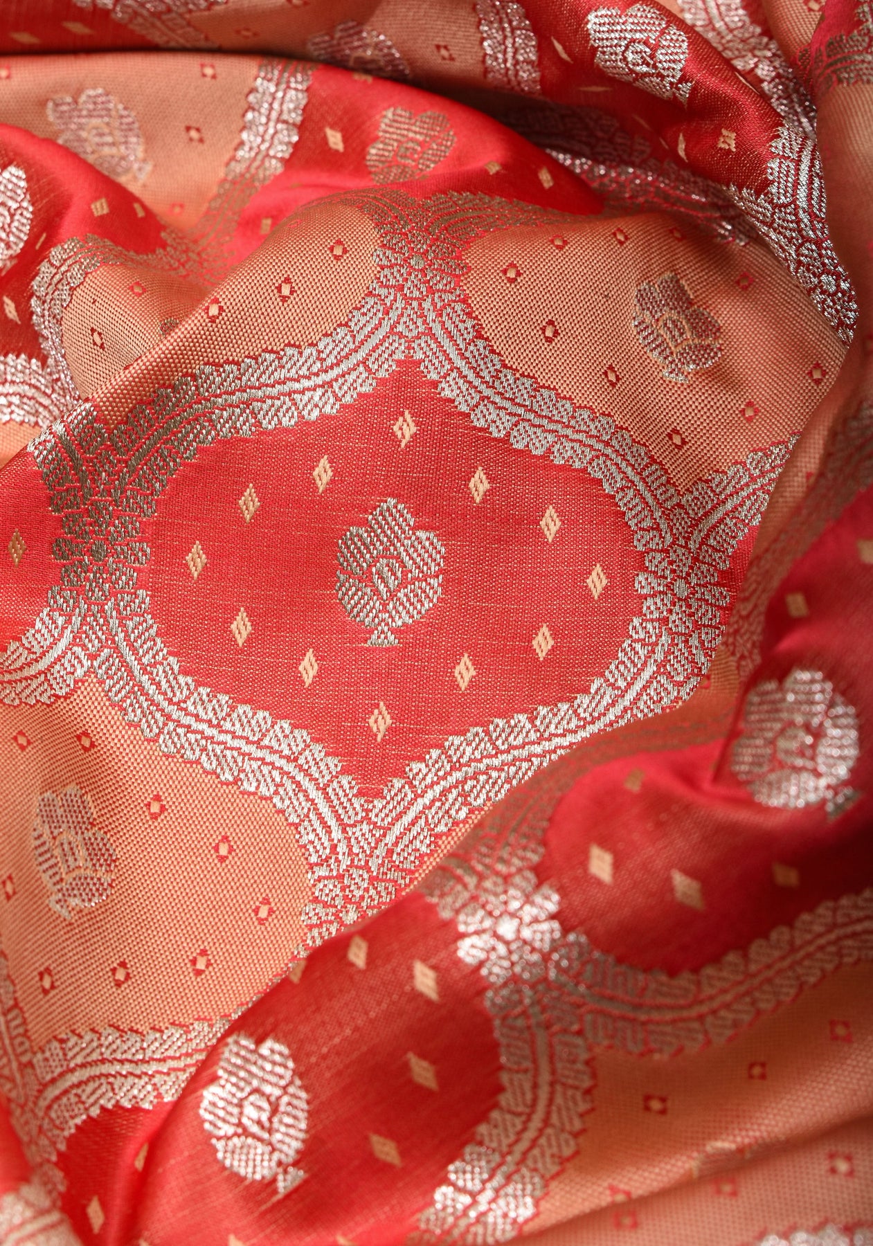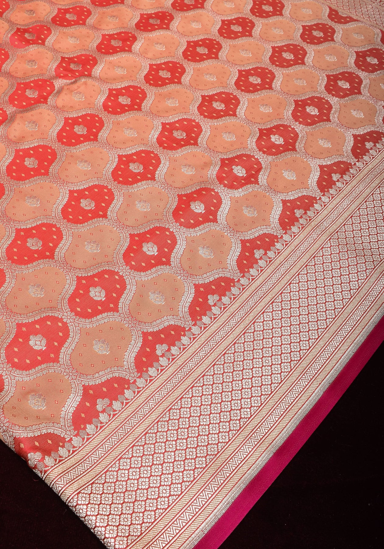 Indulge your playful streak with this Semi Silk Peach pastel red  tone Saree! Featuring a dual tone meenakari Vintage Moroccan pattern, this saree embodies color, texture, and fluid lines. To top it off, the playful pink selvedges and zari border and pallu add an extra pop of color to this whimsical outfit.