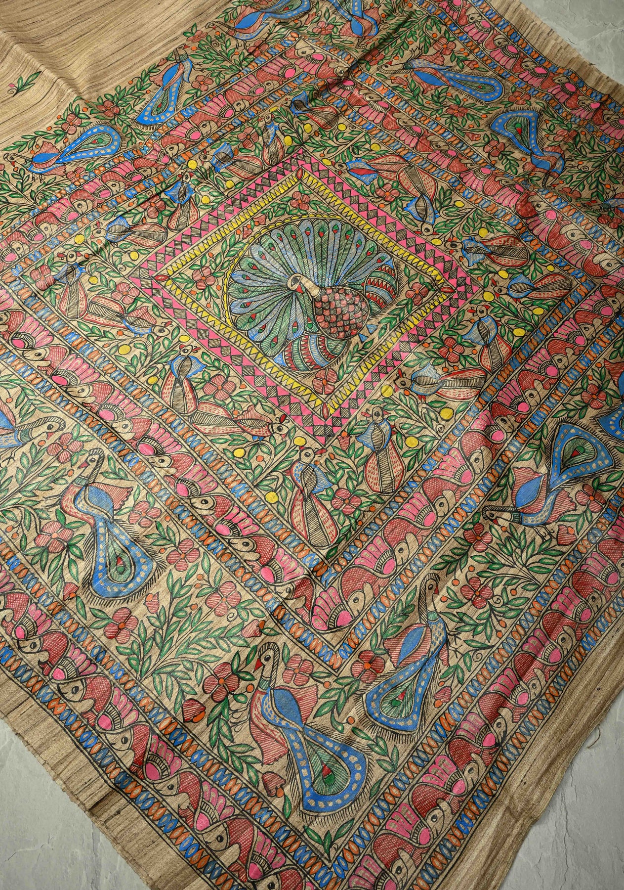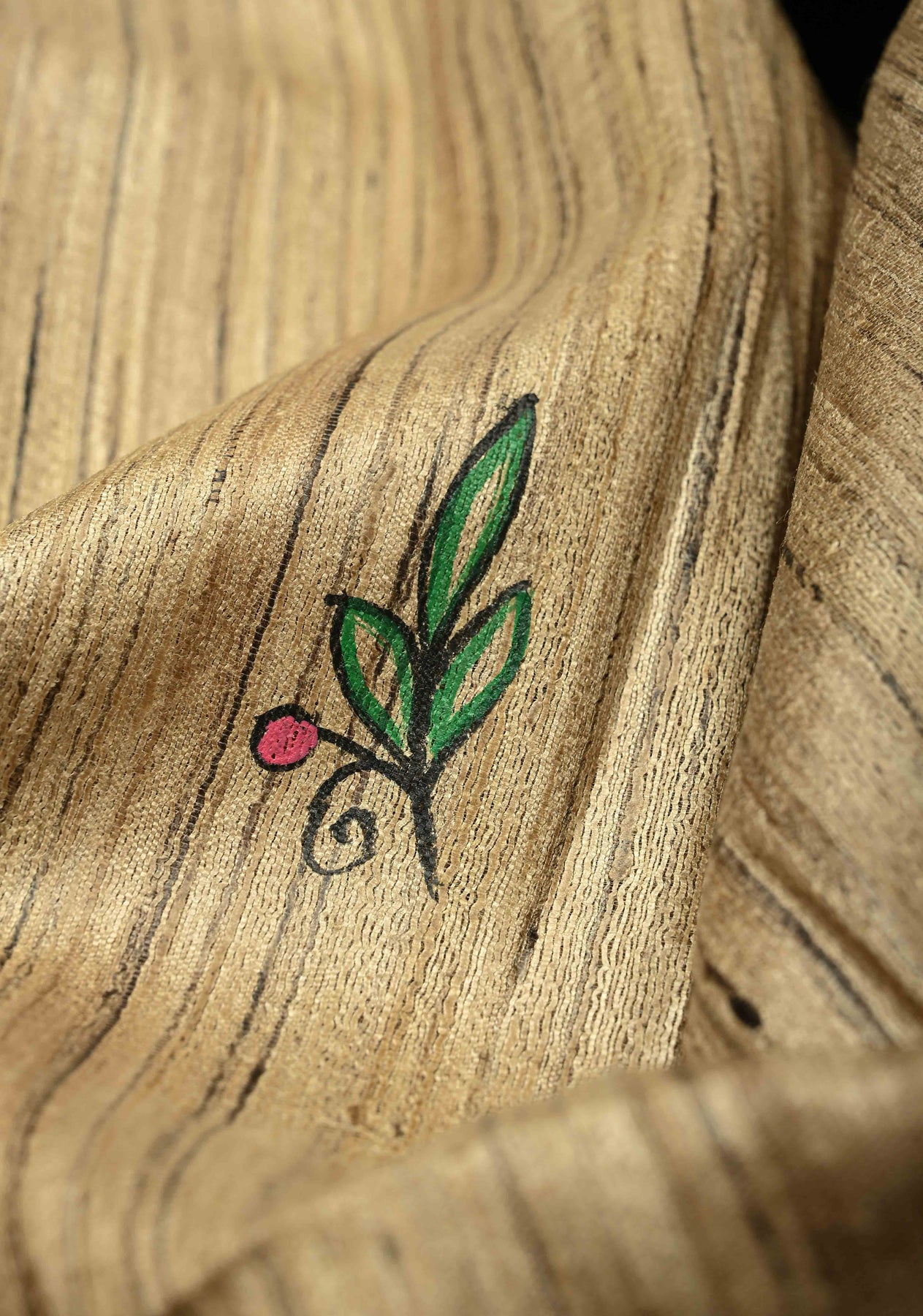 Celebrate the beauty of Indian artistry with this exquisite Kora Color Handloom Tussar Hand-Painted Madhubani Silk Saree. Crafted from handloom Tussar silk, this saree features a , natural texture and a graceful drape. Each piece is adorned with intricate hand-painted Madhubani artwork, showcasing traditional motifs and storytelling patterns created by skilled artisans.