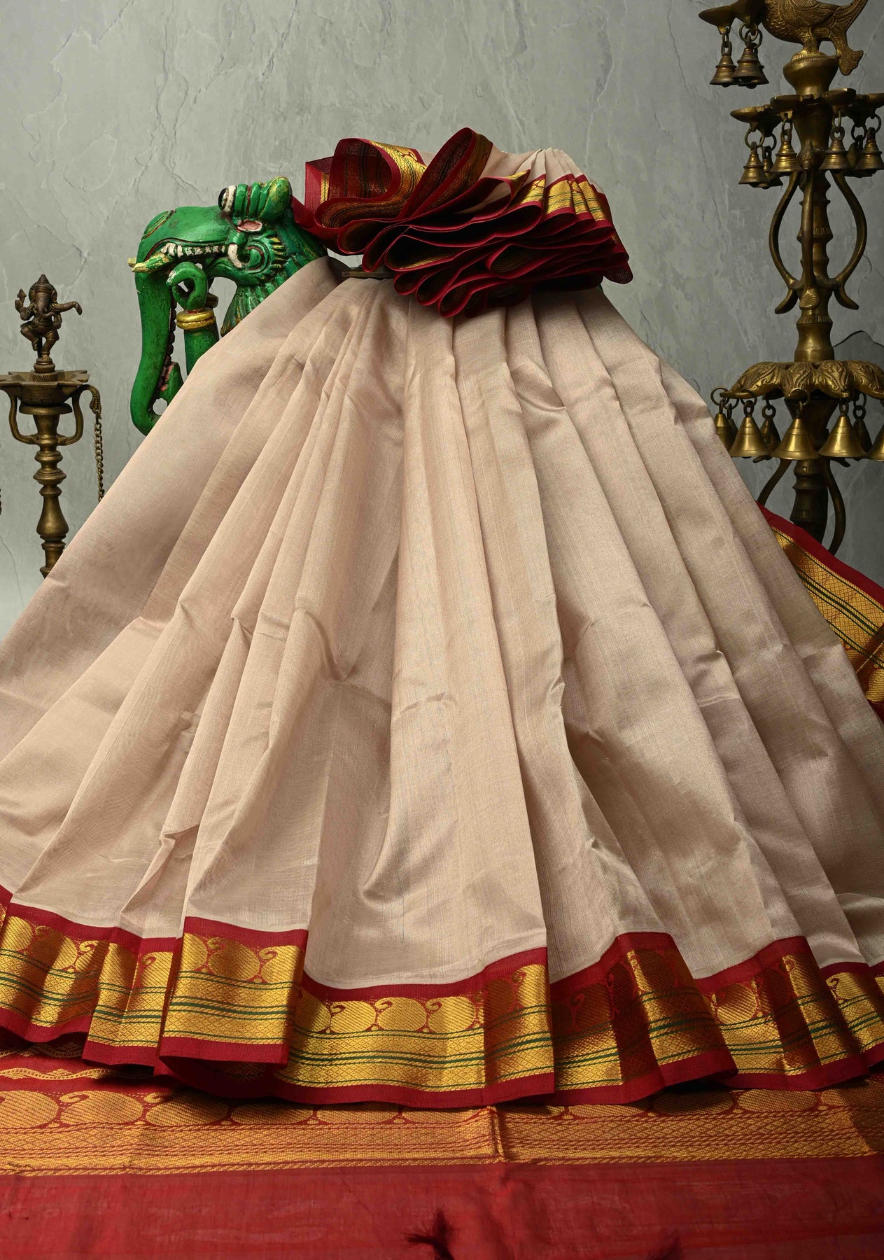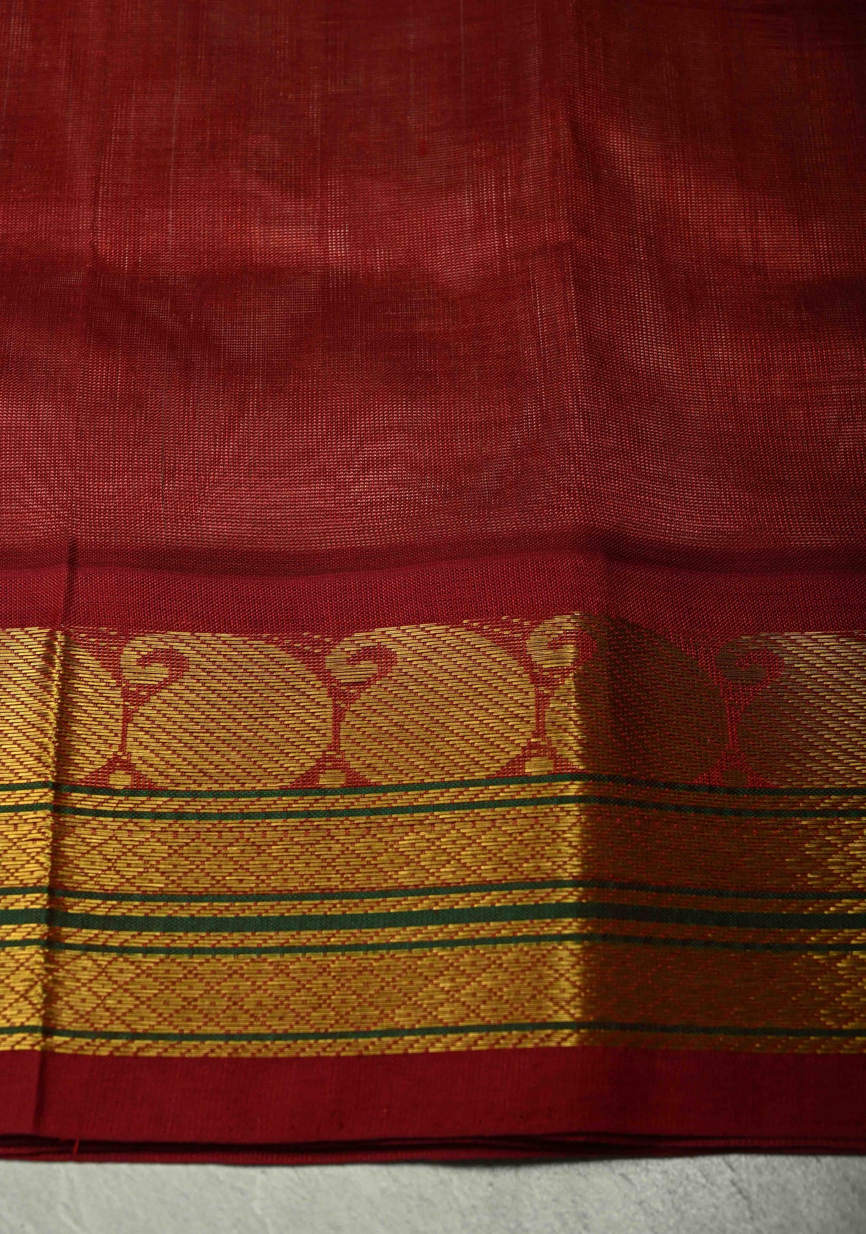 Featuring a contrast zari border, the saree combines subtle elegance with a touch of regal charm, making it perfect for women who appreciate heritage craftsmanship and timeless style.
