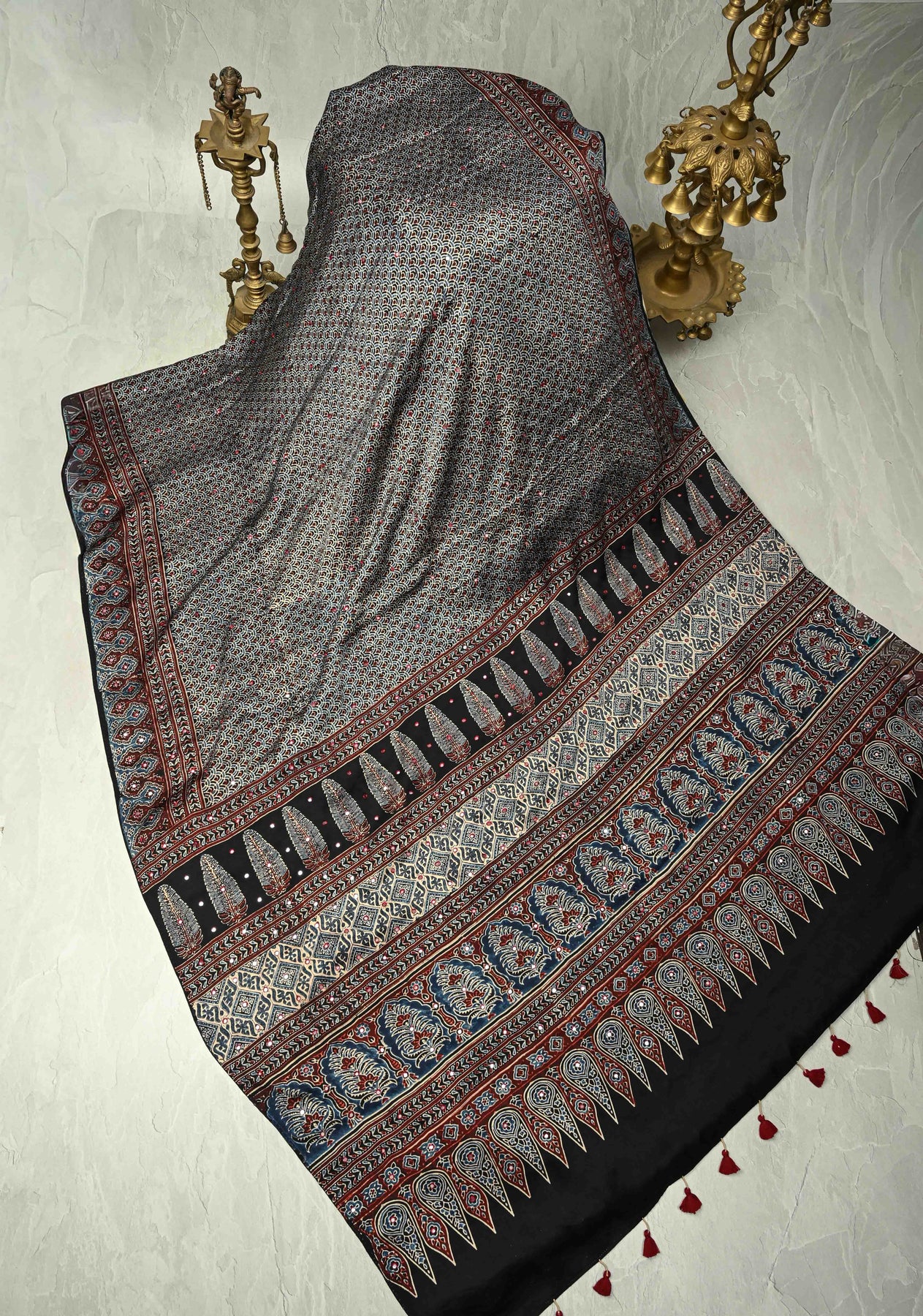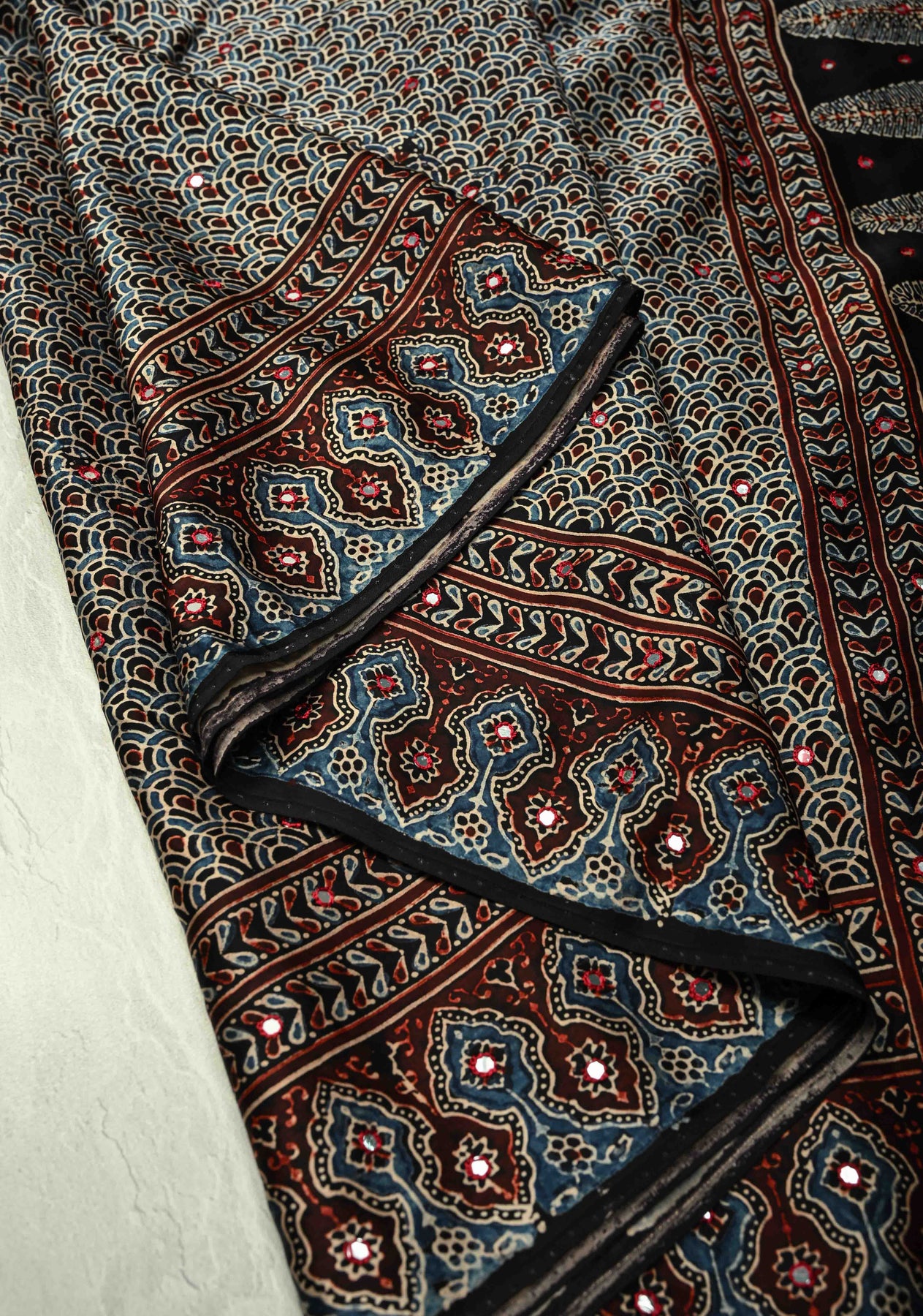 The hand block prints in black and blue create a contemporary yet ethnic appeal, while the Mirror embellishments enhance its artisanal charm. cultural events, and formal occasions, this saree pairs beautifully with statement jewelry for a refined, handcrafted look.