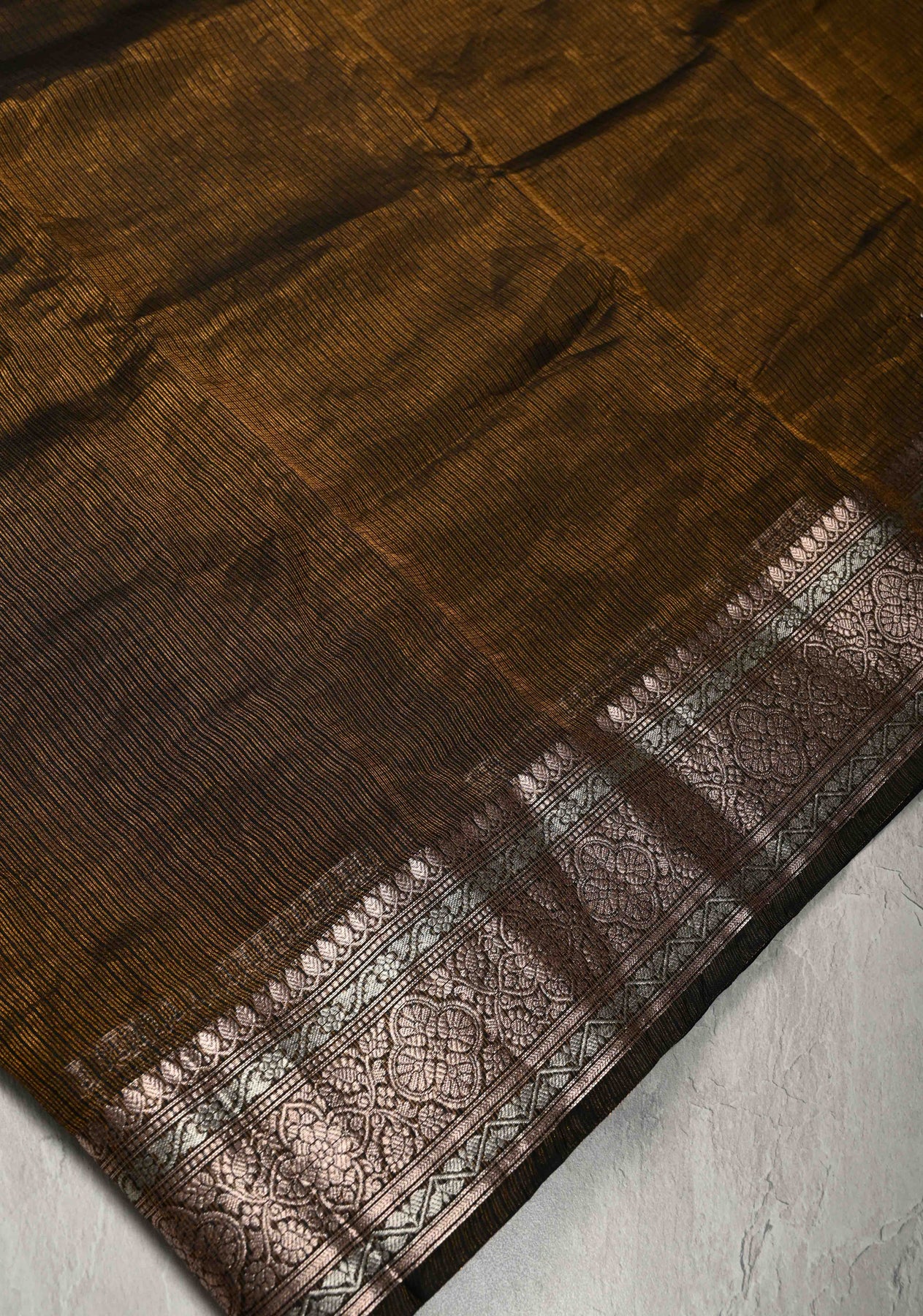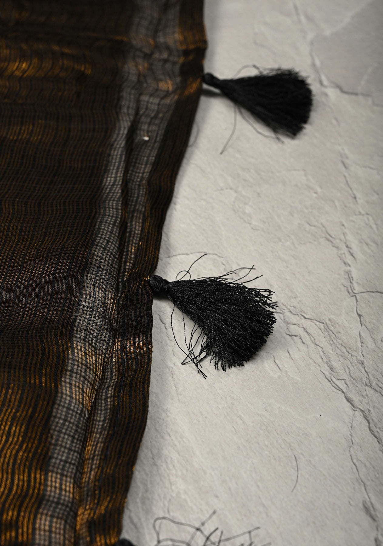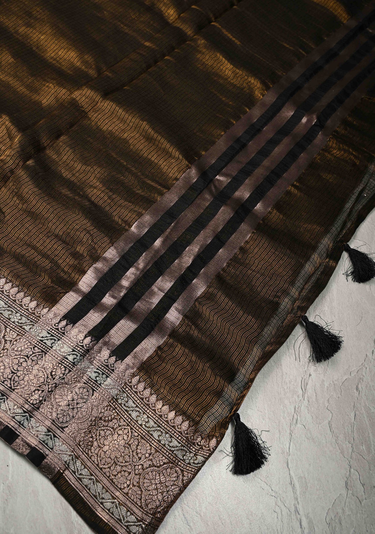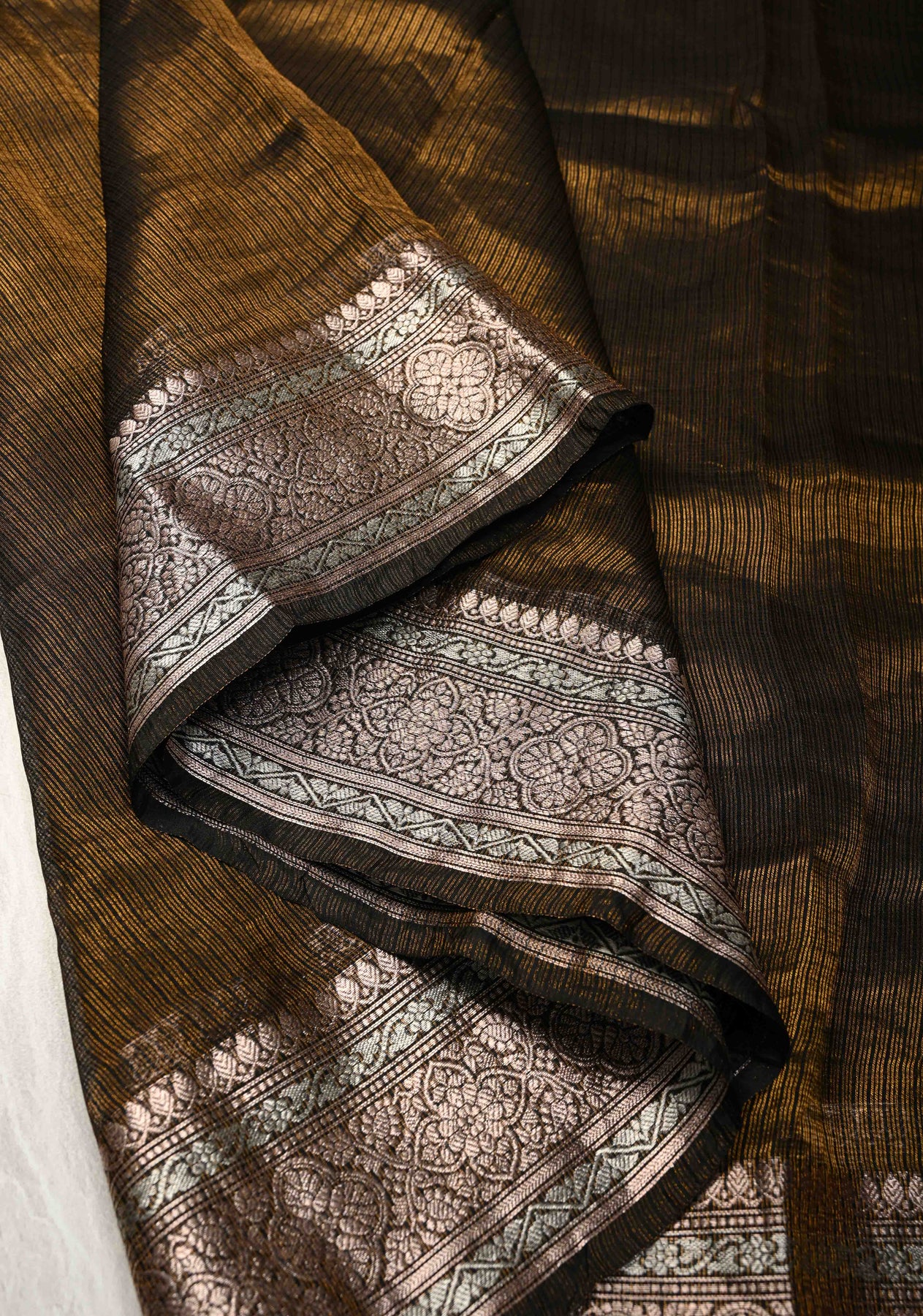 The Black-Gold Banarasi Kota Doria Tissue Cotton Saree is a refined blend of lightweight comfort and traditional Banarasi elegance. Crafted from airy Kota Doria cotton with a subtle tissue finish, it features a black base that beautifully complements the delicate golden shimmer. The saree is adorned with a striking Sona Rupa zari border, woven in gold and silver tones, adding a touch of grandeur to its understated grace. The fine checkered weave typical of Kota Doria enhances its texture, making it breathable yet luxurious. Perfect for festive gatherings, formal occasions, or elegant daywear.