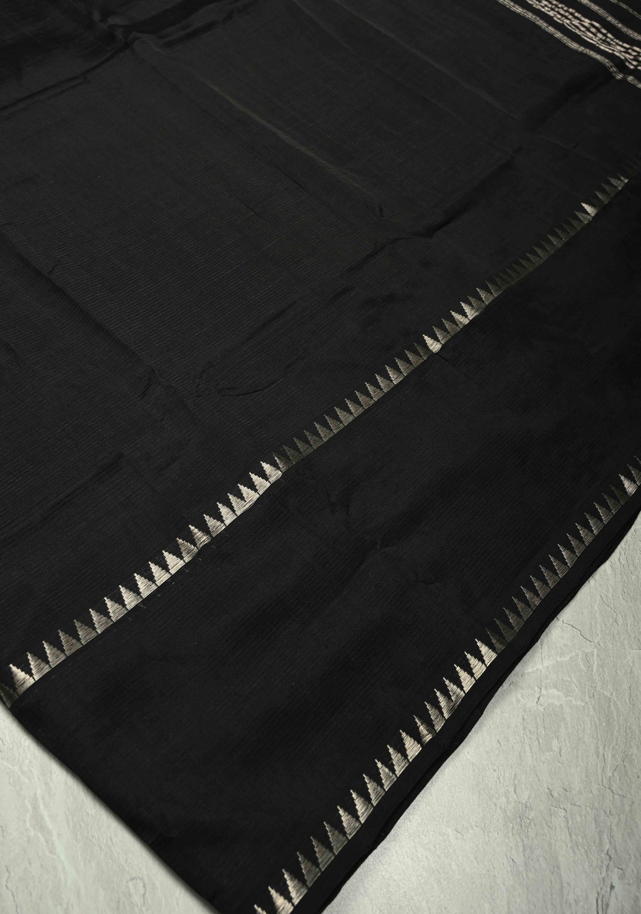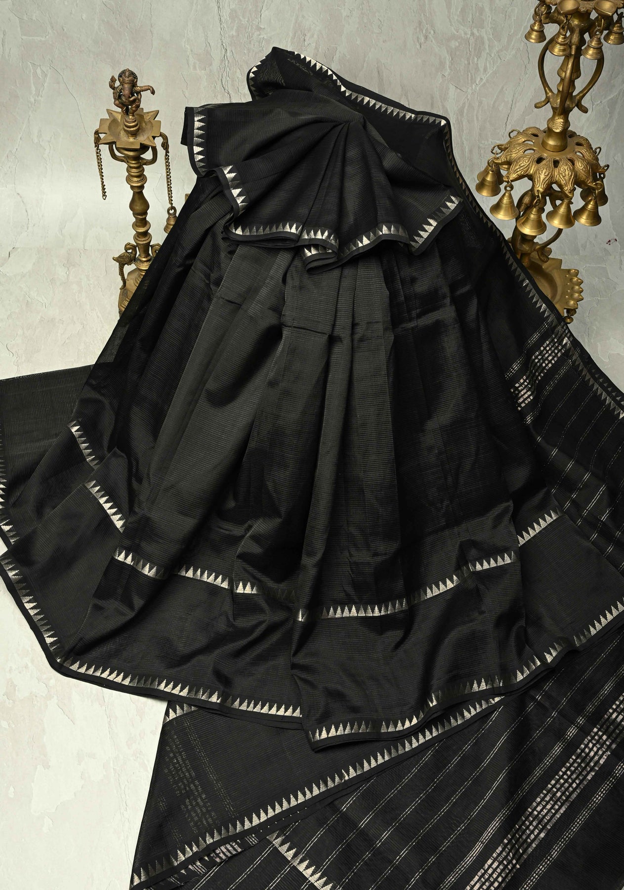 Make a bold yet elegant statement with this Black Handwoven Mangalagiri Silk Cotton Saree, a timeless piece that blends tradition with sophistication. Expertly woven in the heritage town of Mangalagiri, this saree features a rich silk-cotton blend known for its durability, soft texture, and graceful drape. The deep black body is beautifully contrasted by a wide temple-style zari border, adding a touch of regal charm. Lightweight and breathable, it is ideal for festive occasions, formal gatherings, or classic everyday elegance. A must-have for lovers of authentic handloom weaves.