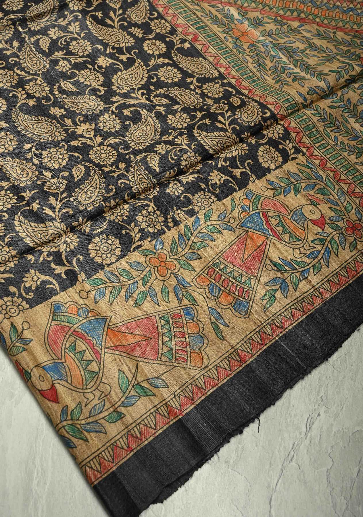 The Black Pure Handloom Tussar Silk Saree is a timeless blend of elegance and artistry, crafted for those who appreciate traditional handloom luxury. Its rich black body highlights the natural texture and sheen of premium Tussar silk, creating a sophisticated canvas for intricate detailing. The saree features exquisite block prints that add subtle, handcrafted charm, while the Madhubani hand-painted border and pallu elevate it into a wearable work of art. Each stroke reflects the cultural heritage and storytelling essence of Mithila folk art, making the saree not just an outfit but a collector’s piece. Lightweight, graceful, and visually striking, this saree is perfect for festive occasions, cultural celebrations, or moments when you want to make a refined statement.