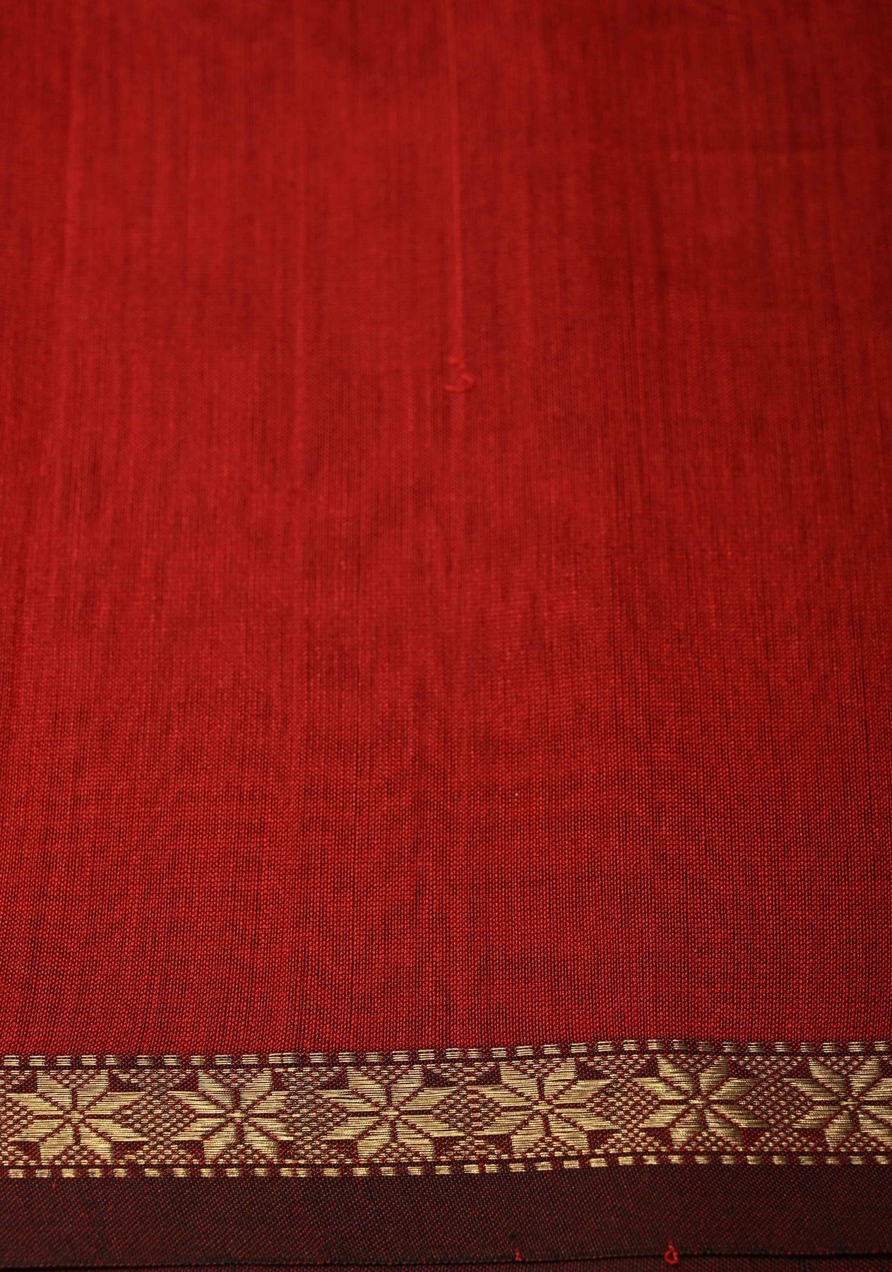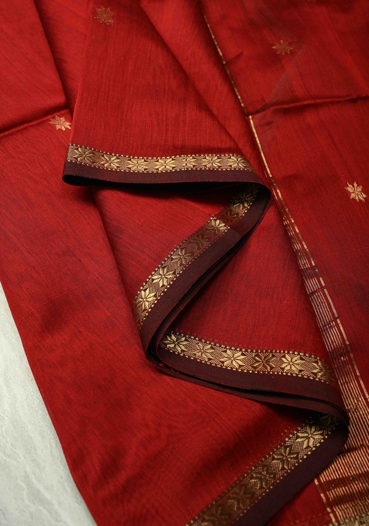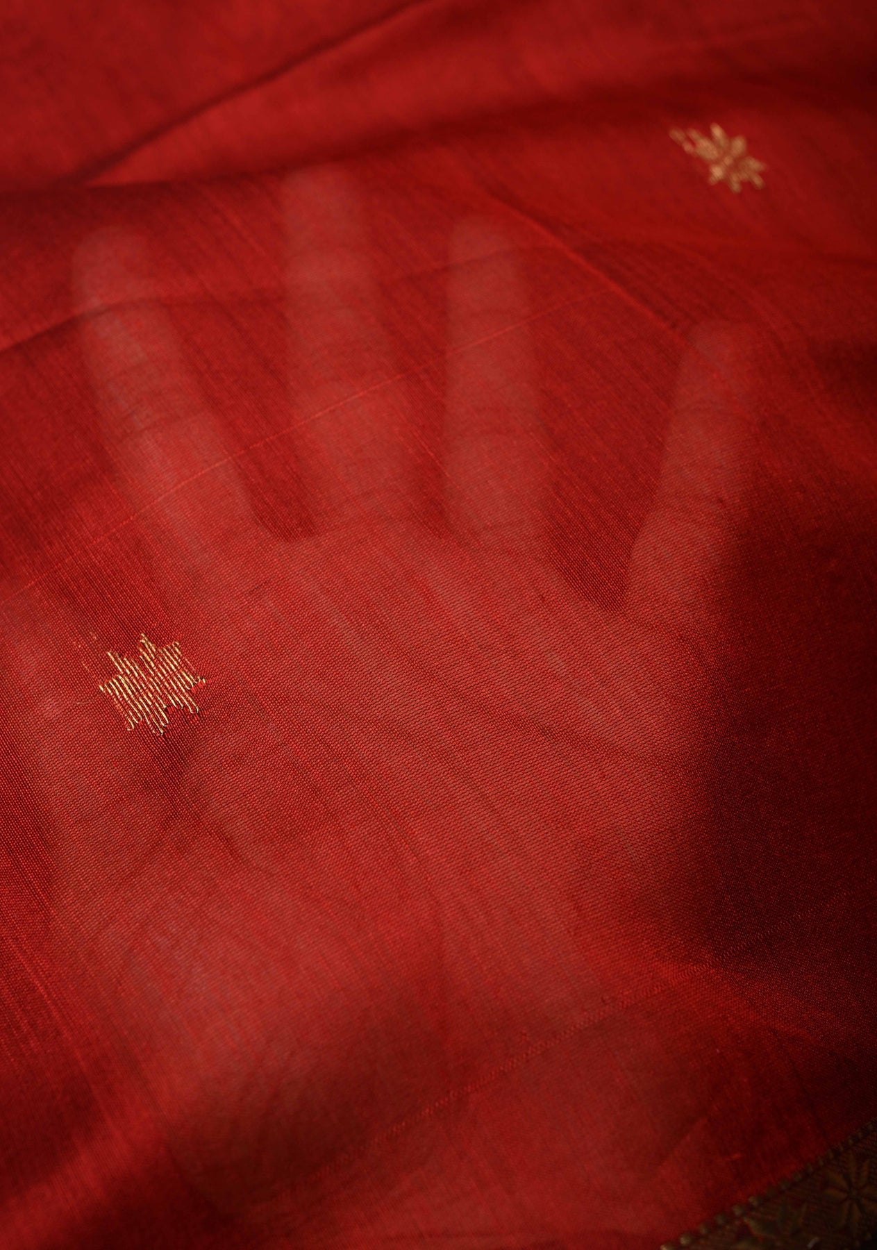 Embrace timeless elegance with this Blood Red Handwoven Maheshwari Silk Cotton Saree, crafted to offer a lightweight and graceful drape. The saree is adorned with delicate zari buttas, adding subtle shimmer and sophistication to its rich red base.