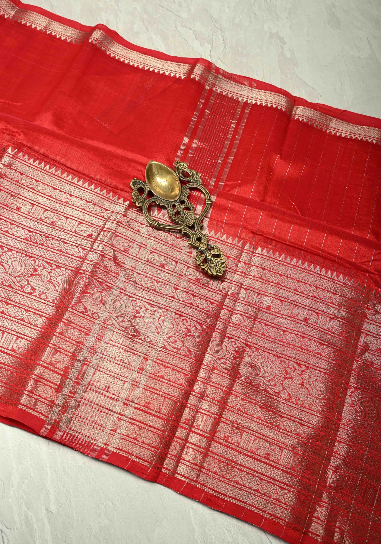 Bright Red Handwoven Mangalagiri Silk Cotton Saree with Wide Silver Zari Border