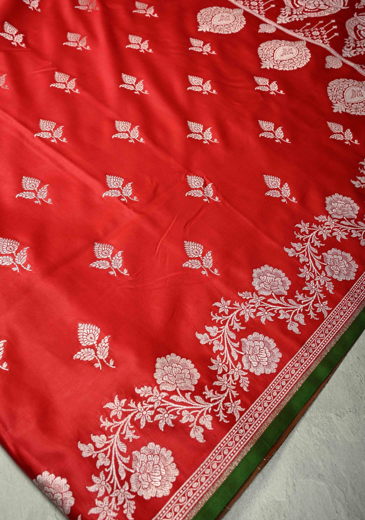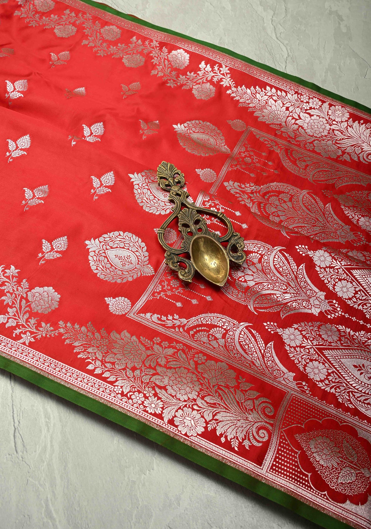 Adorned with delicate floral silver zari buttas, the saree exudes a contemporary sparkle that adds sophistication to its vivid color palette. A graceful silver zari border further elevates the look, merging traditional Banarasi artistry with a modern metallic finish. Lightweight, smooth, and exquisitely elegant, this saree is ideal for receptions, festive celebrations, weddings, and special events.