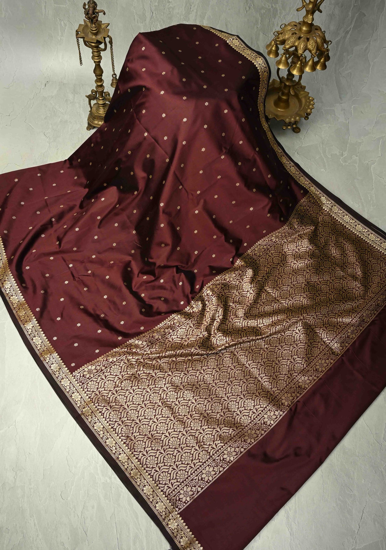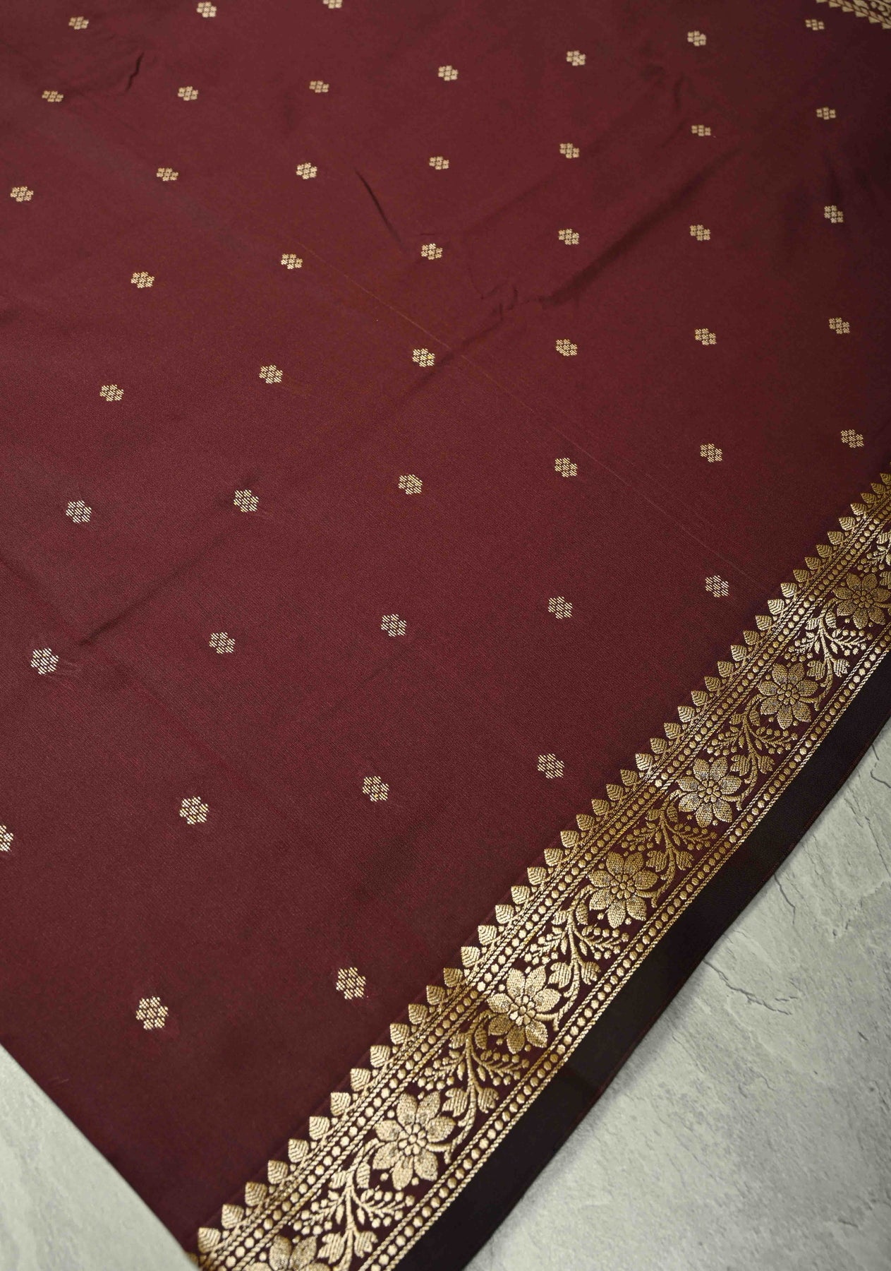The Chocolate Brown Semi Silk Saree with Chunri Buttis exudes understated elegance and timeless appeal. Crafted from semi-silk fabric, this saree offers a smooth, fluid drape that feels luxurious while remaining comfortable. The classic chunri butti pattern, delicately scattered across the fabric, adds a touch of traditional charm. A minimal zari border enhances the design with just a hint of sparkle, offering a perfect balance between simplicity and sophistication. The chocolate brown hue brings warmth and depth to the look, making it an ideal choice for evening events, intimate gatherings, or festive occasions where subtle grace is key.
