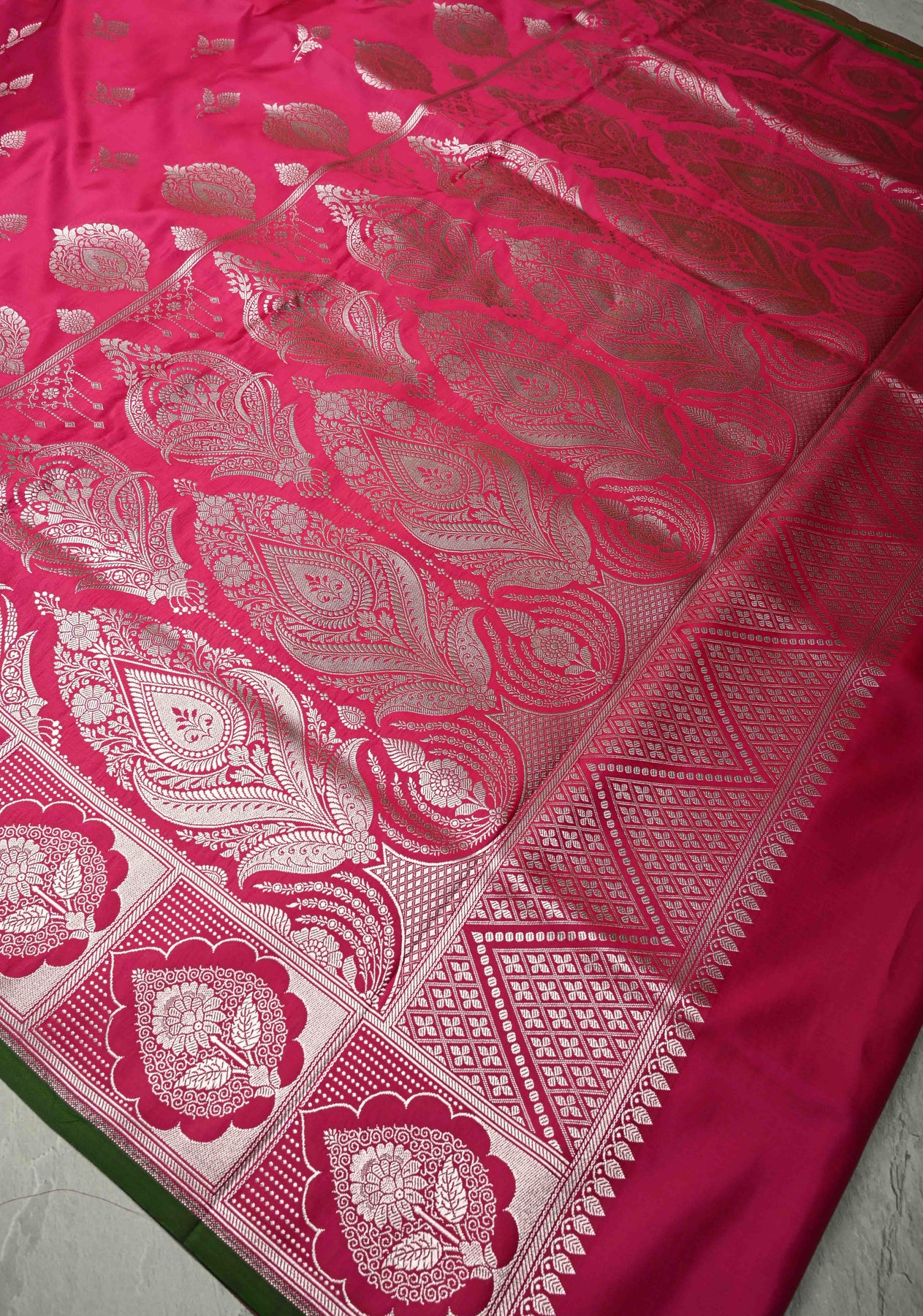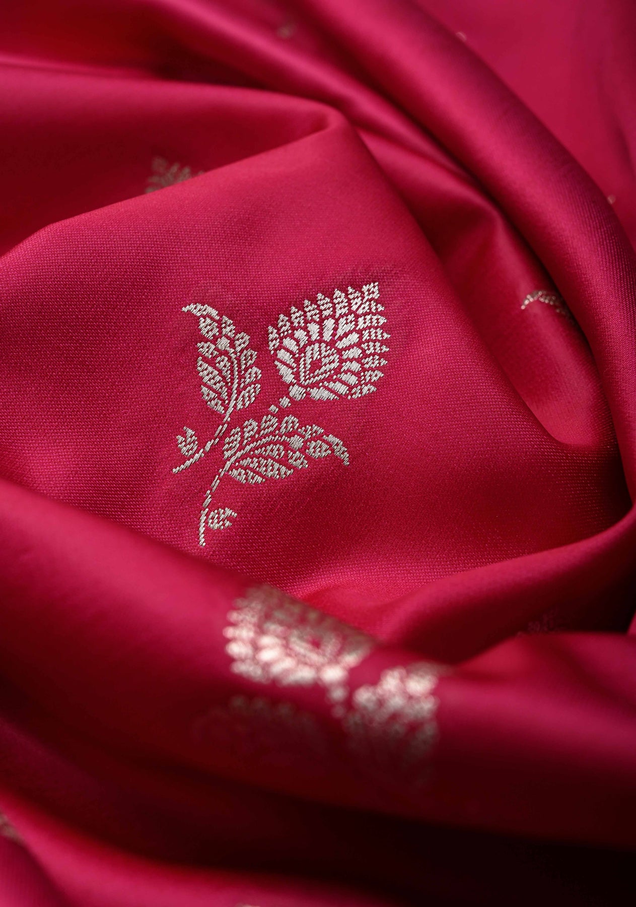 Drape yourself in opulent charm with this Dark Pink Banarasi Semi Mashru Silk Saree, a stunning blend of tradition and contemporary elegance. The dark pink hue highlights the silky sheen of Mashru fabric, creating a luxurious drape that feels as beautiful as it looks. Delicately woven silver zari buttas adorn the body, adding subtle shimmer and classic Banarasi artistry. The saree is finished with an exquisite floral zari border, elevating its regal appeal and making it perfect for weddings, celebrations, and grand occasions.
