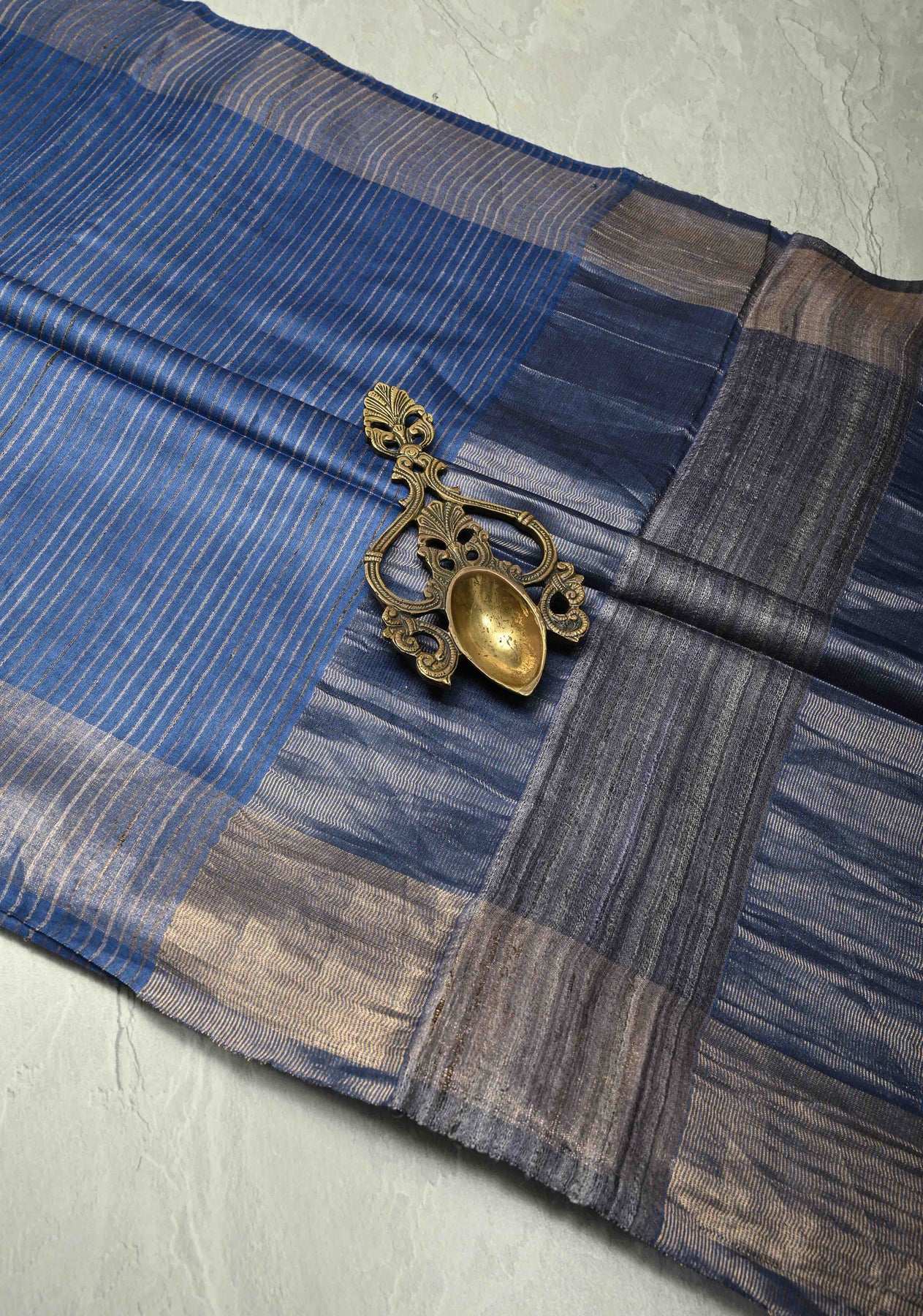 Embrace timeless grace with this Ink Blue Handloom Tussar Silk Saree, crafted to highlight the natural beauty and texture of pure tussar silk. The ink blue shade exudes sophistication, making it perfect for both elegant daytime events and refined evening occasions. A muted zari border adds a subtle touch of luxury, while the thoughtfully designed panel pallu enhances its artistic appeal. Lightweight, drapable, and effortlessly classy, this saree is a beautiful expression of traditional craftsmanship and modern elegance.