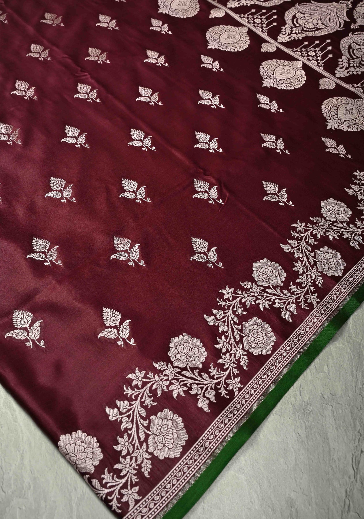 The Kanchana Banarasi Semi Mashru Silk Saree is a majestic piece that embodies the grandeur of traditional Indian weaving. Made from semi-mashru silk, the saree features a soft, lustrous texture that drapes beautifully, making it perfect for festive occasions. The Kanchana tone enhances its royal appeal, while intricate zari buttas (motifs) are woven throughout the fabric, adding a touch of regal elegance. The saree is bordered with a stunning floral zari design, showcasing intricate craftsmanship in silver and gold zari threads. This exquisite piece is ideal for weddings, receptions, and other grand celebrations, offering a timeless blend of classic beauty and luxurious craftsmanship.