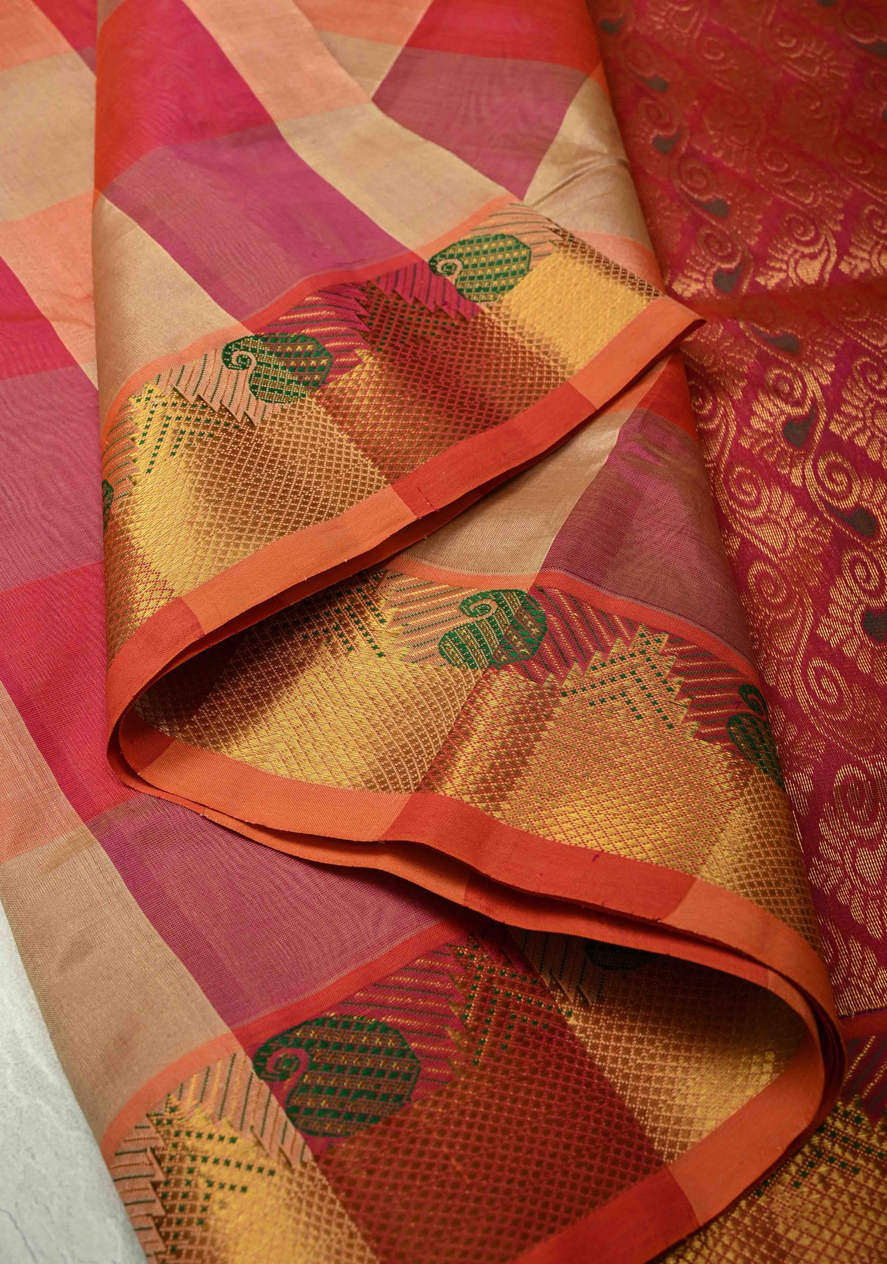 Celebrate traditional elegance with this Multicolor Palum Pazhamum Kanchi Silk Cotton Saree, handwoven with the classic Palum Pazhamum design. Made from 100% silk cotton, it offers a soft, lightweight drape with a luxurious feel.