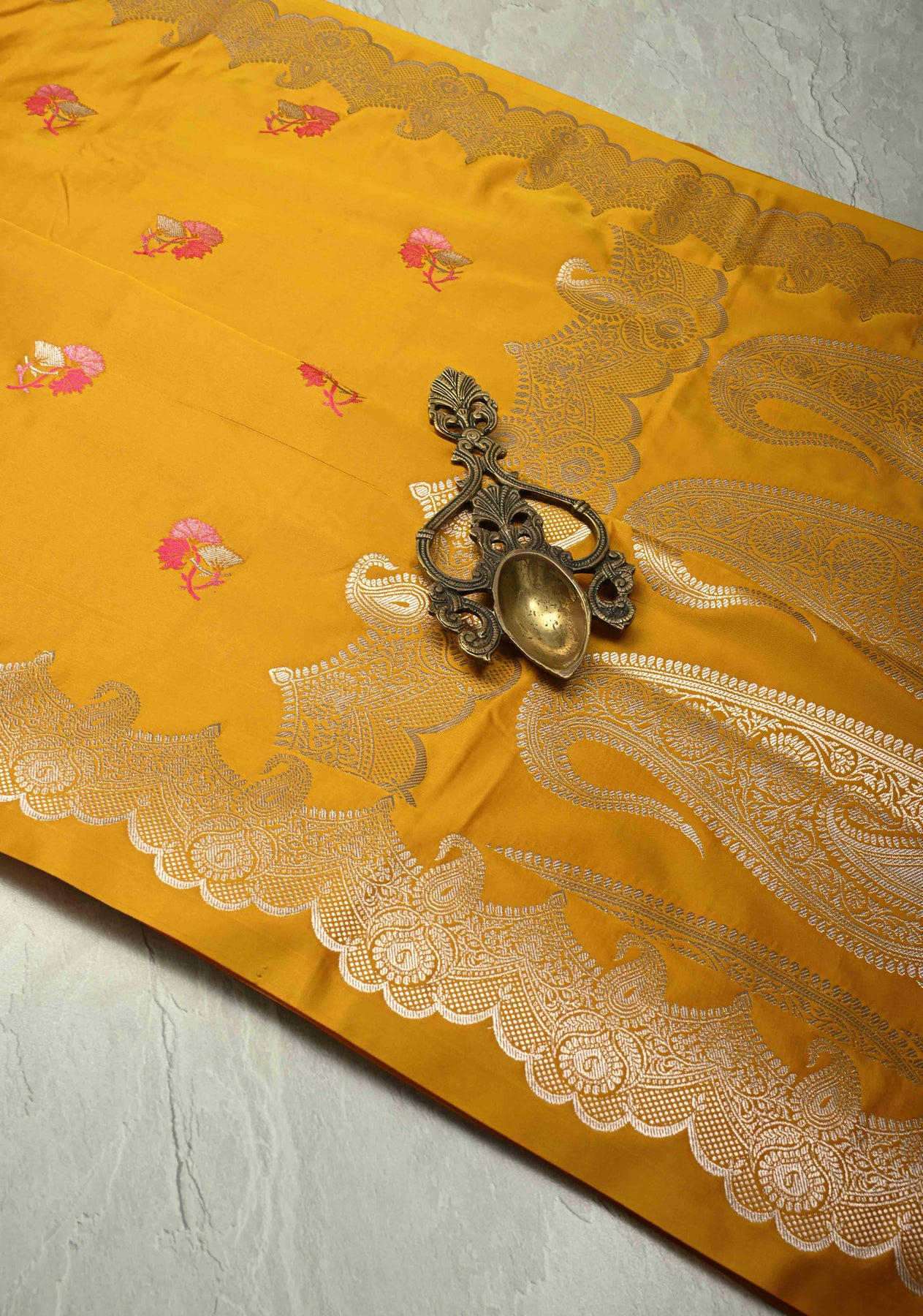 Brighten your festive look with this exquisite Mustard Yellow Banarasi Semi Mashru Silk Saree, crafted with a smooth, lustrous drape that beautifully enhances its rich color. The saree is adorned with delicate Meenakari floral buttas, adding intricate detailing and vibrant accents across the body.