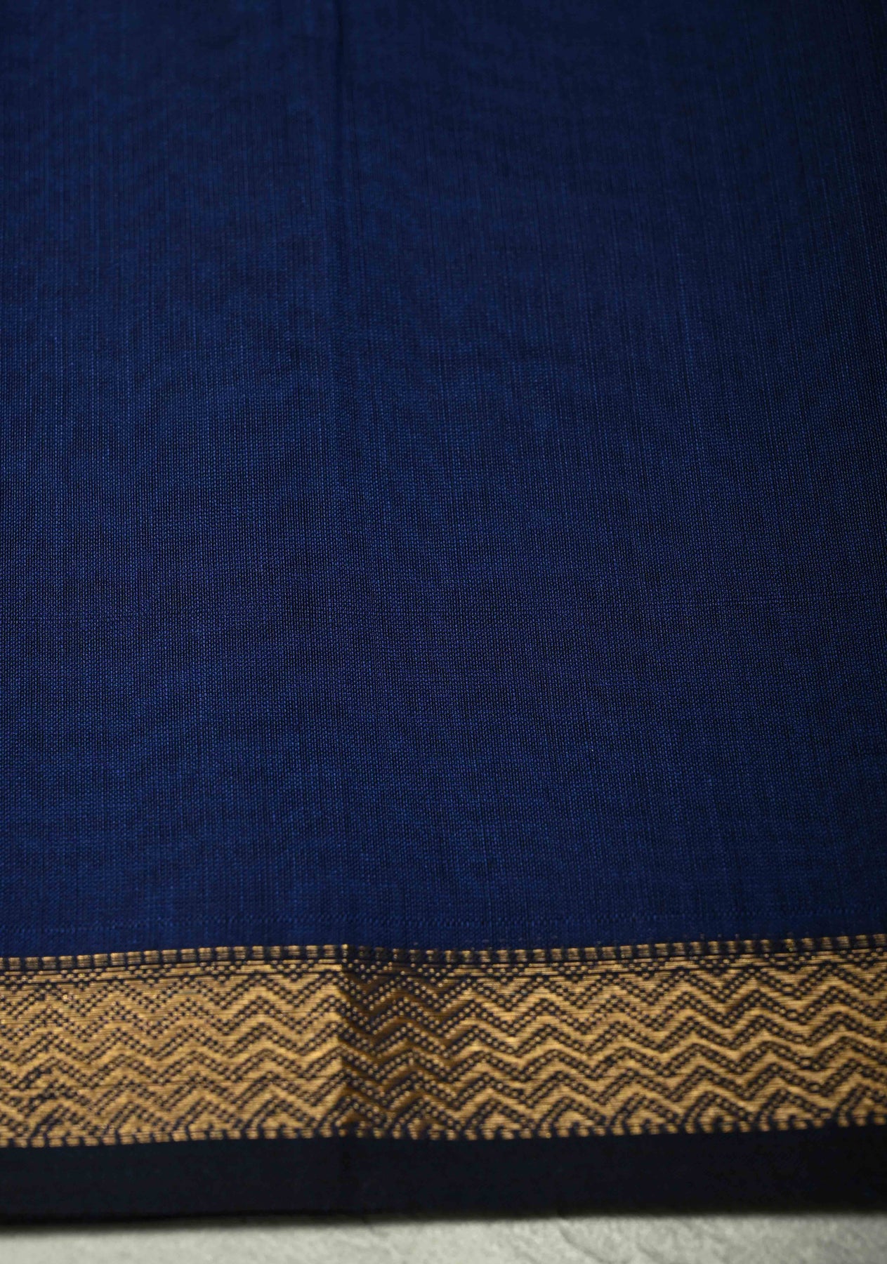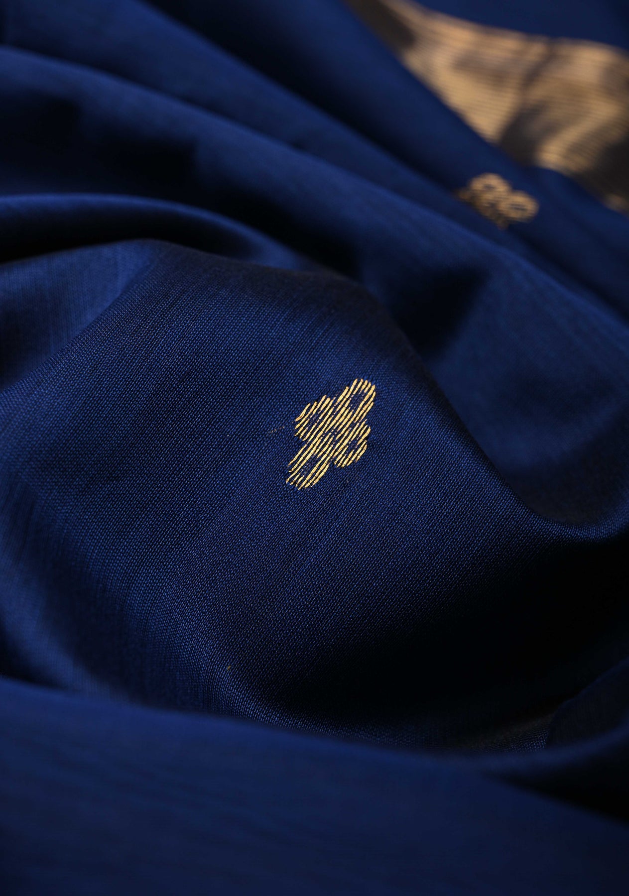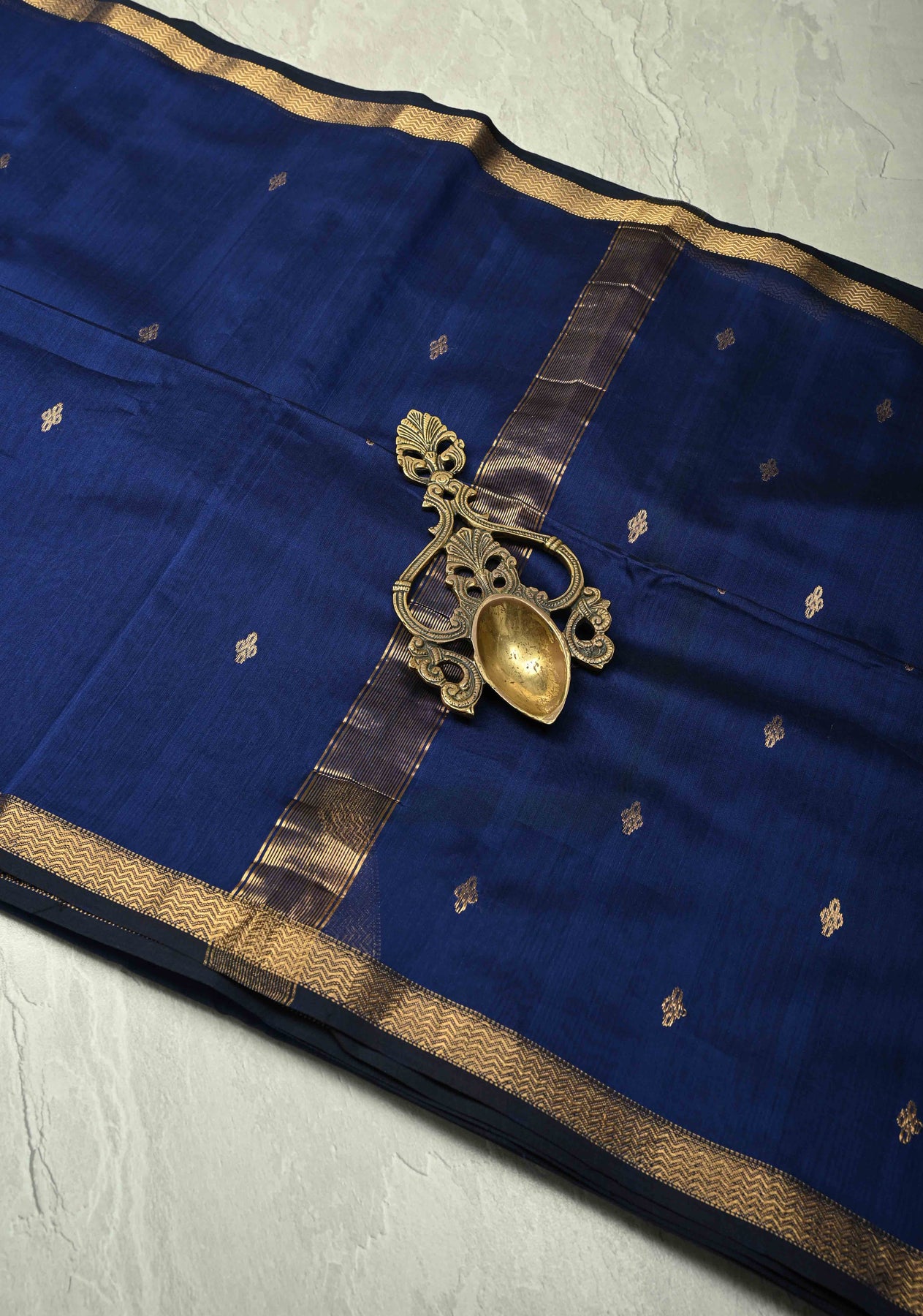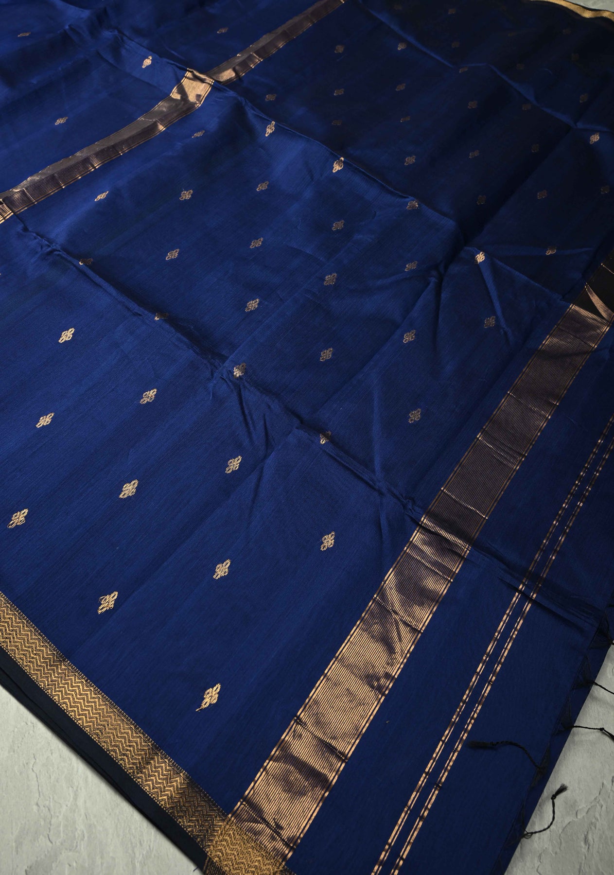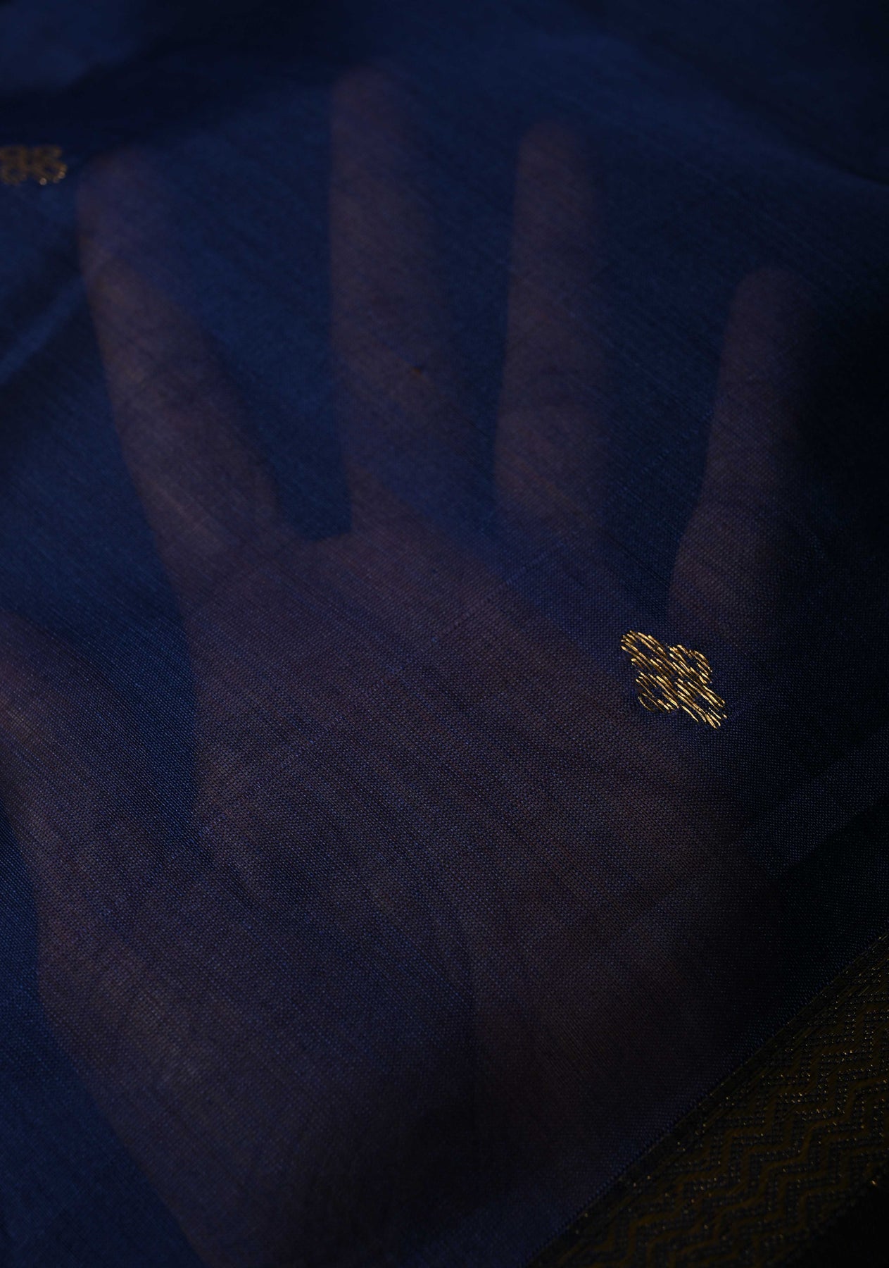 Elevate your ethnic wardrobe with this elegant Navy Blue Handwoven Maheshwari Silk Cotton Saree, featuring a smooth, lightweight drape perfect for long hours of wear. The saree is adorned with delicate zari buttas, adding subtle shimmer to its navy base while maintaining a refined, traditional appeal.