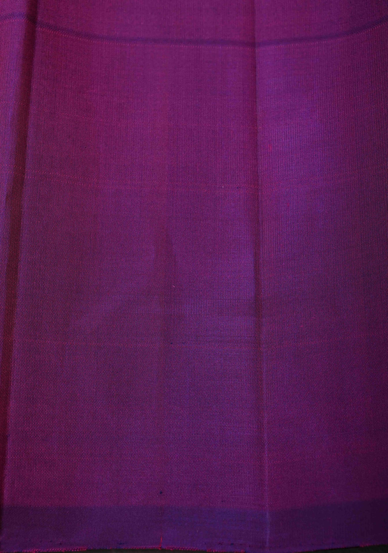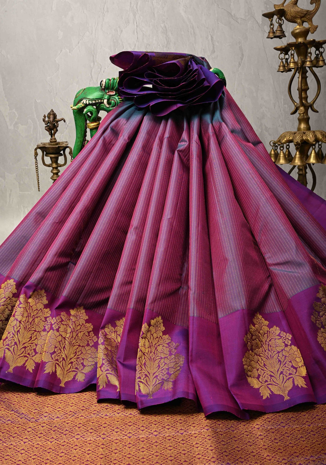 Purple-Teal Pure Kanjivaram Silk Handloom Saree with Vairaoosi Zari Stripes and Distinct Floral Motofs on Border  | SILK MARK CERTIFIED